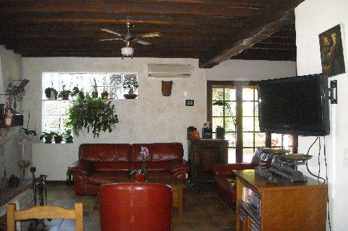 Grande salle de séjour avec poutres apparentes, cheminée, salon en cuir, meubles de caractère.