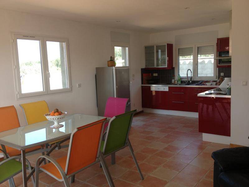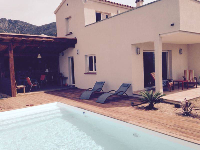 Agréable maison neuve climatisée avec piscine privée, située dans un quartier très calme (Mas Bosca dans Rosas). La maison comporte, au rez-de-chaussée, un séjour avec cuisine américaine donnant sur une terrasse couverte et une cuisine d'été avec un bar, un barbecue et une planche. Toujours au rez-de-chaussée, se trouve une grande chambre avec salle de bain intégrée, un WC séparé, un cellier et un garage. A l'étage, il y a deux chambres doubles et une salle de bain avec WC.