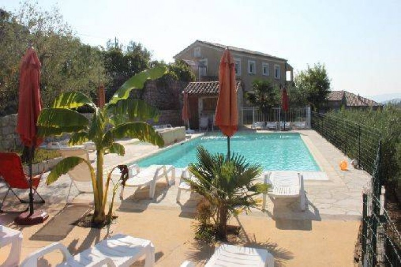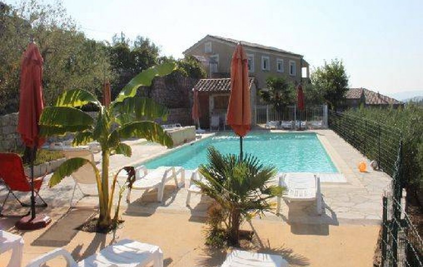La Piscine (12m x 6m) est commune aux 3 gîtes + propriétaires. Entourée d'oliviers et joliment aménagée et entretenue, elle bénéficie d'un panorama de toute beauté.