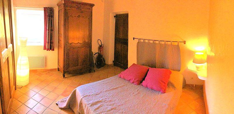 A l'étage, une chambre 1 lit 2 personnes avec vue piscine,