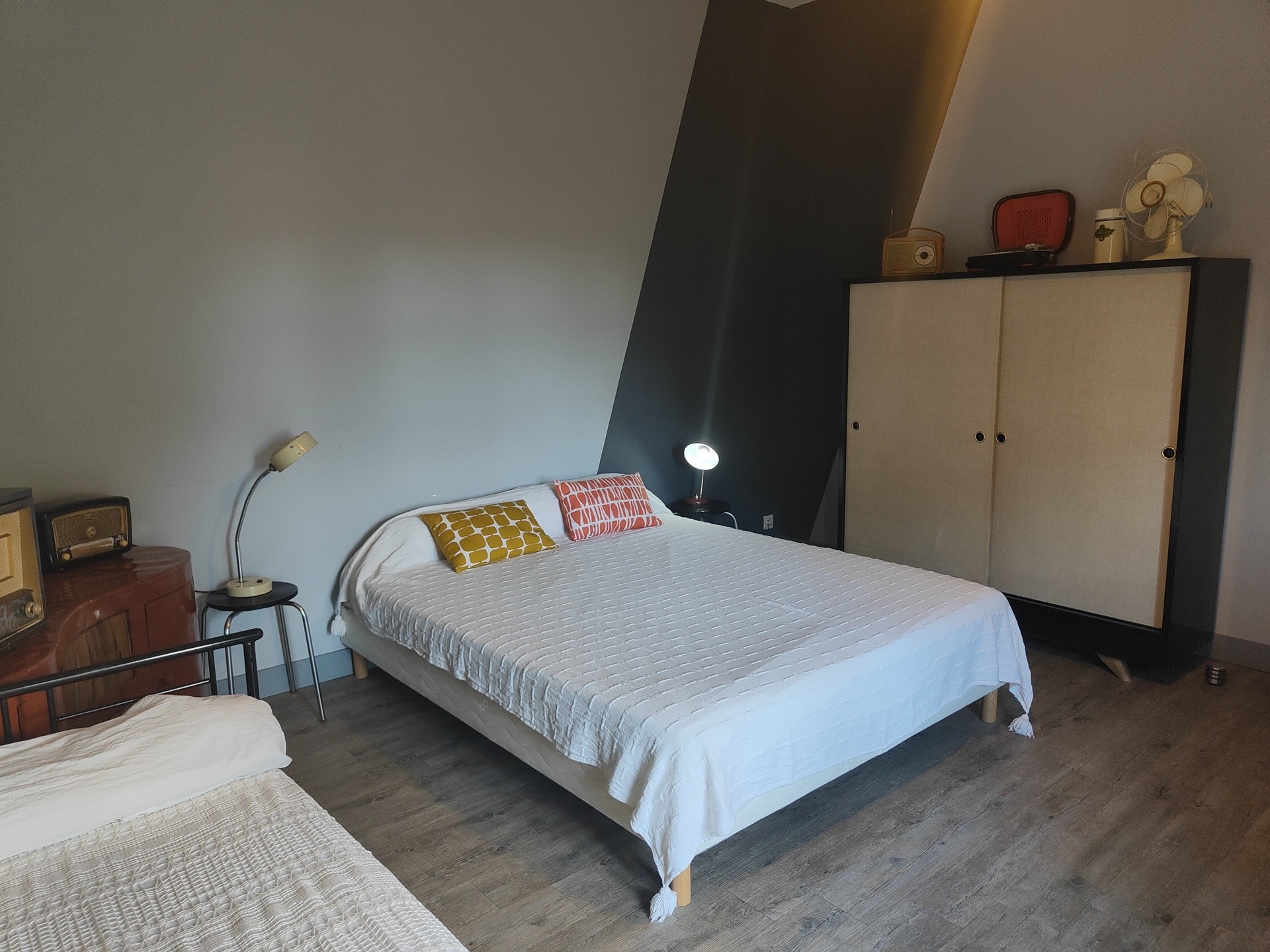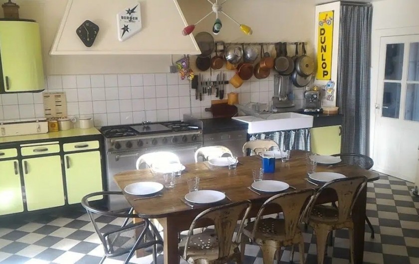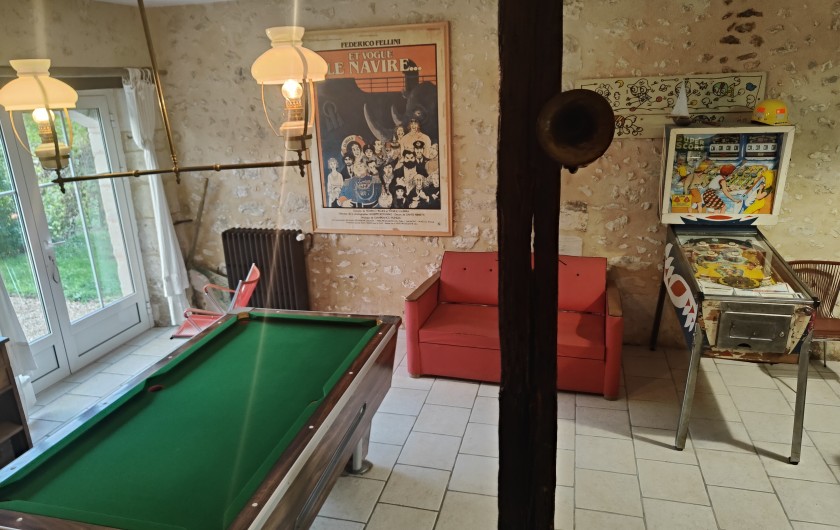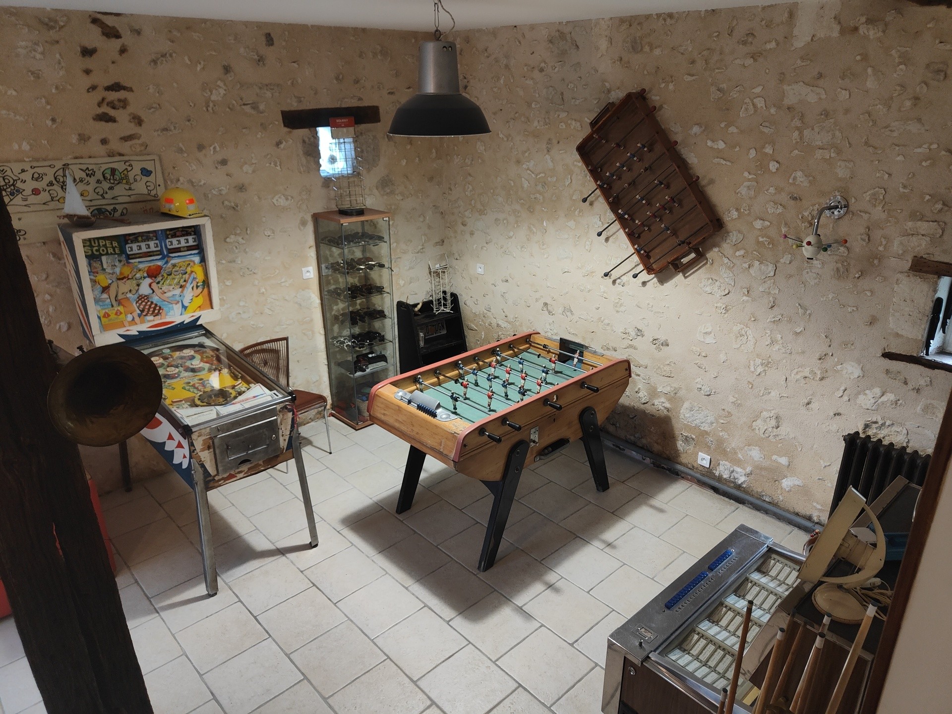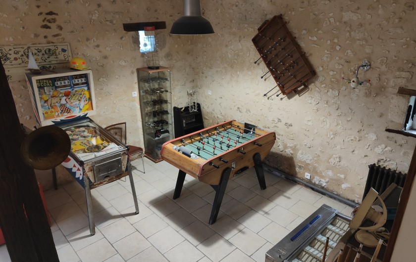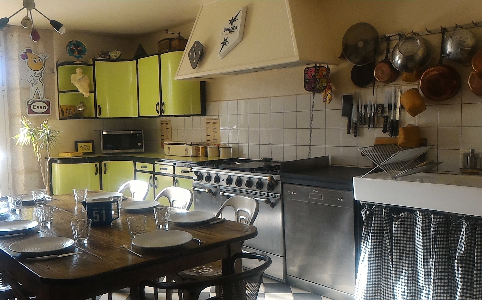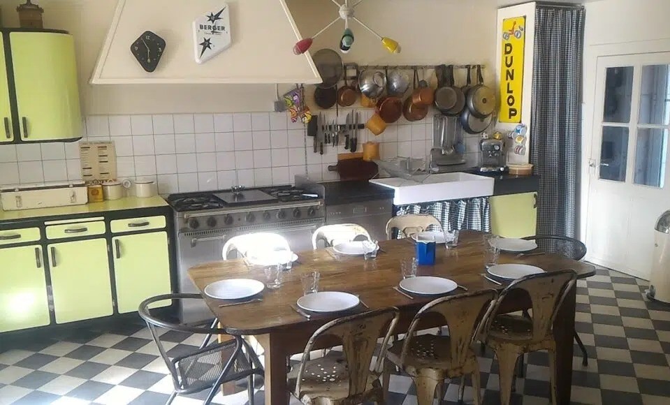 La maison se compose au rez-de-chaussée d’une cuisine meublée années 50 offrant tout l’équipement nécessaire pour les grandes familles et les groupes d’amis (frigo américain, piano Godin, grande table de ferme, lave vaisselle…), d’un salon chaleureux, d’une salle de jeux avec billard et baby foot et d’un WC.