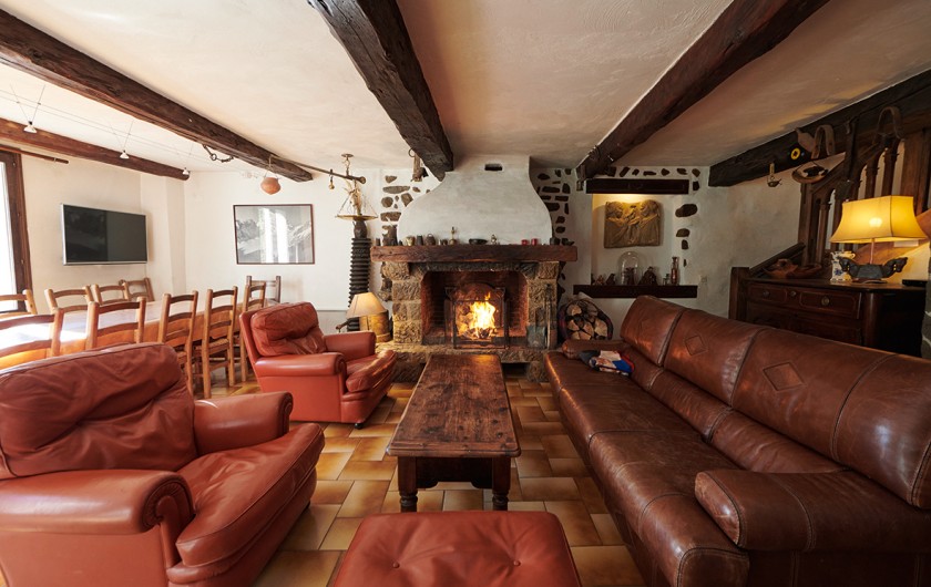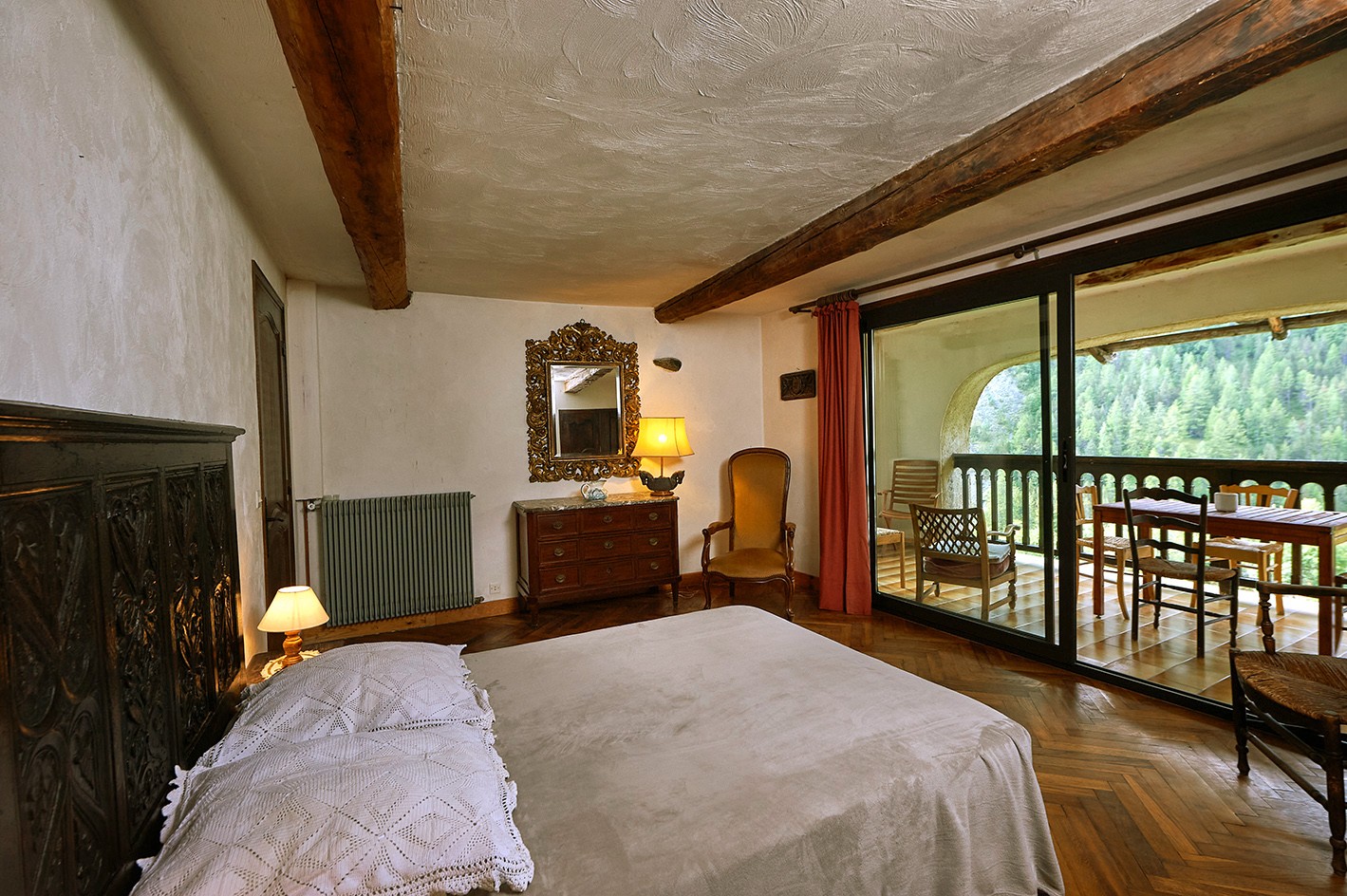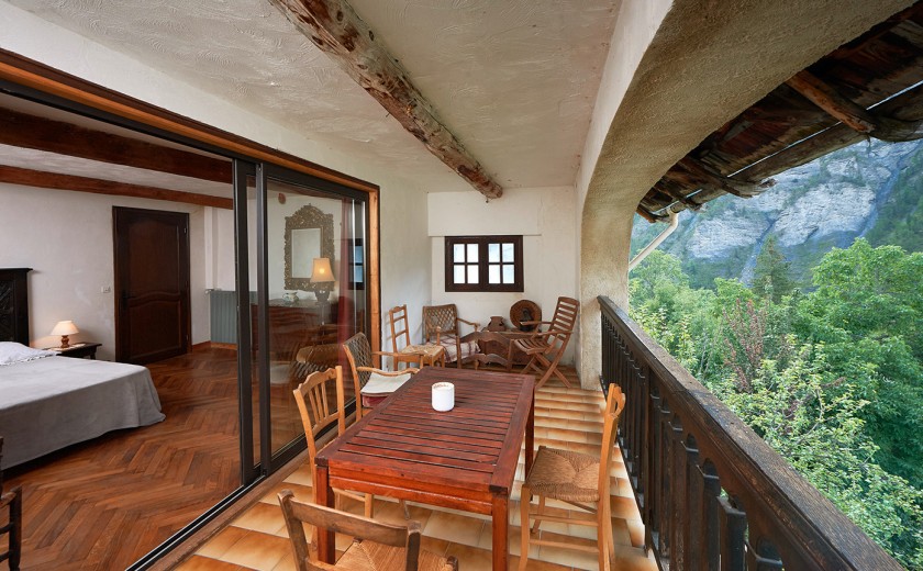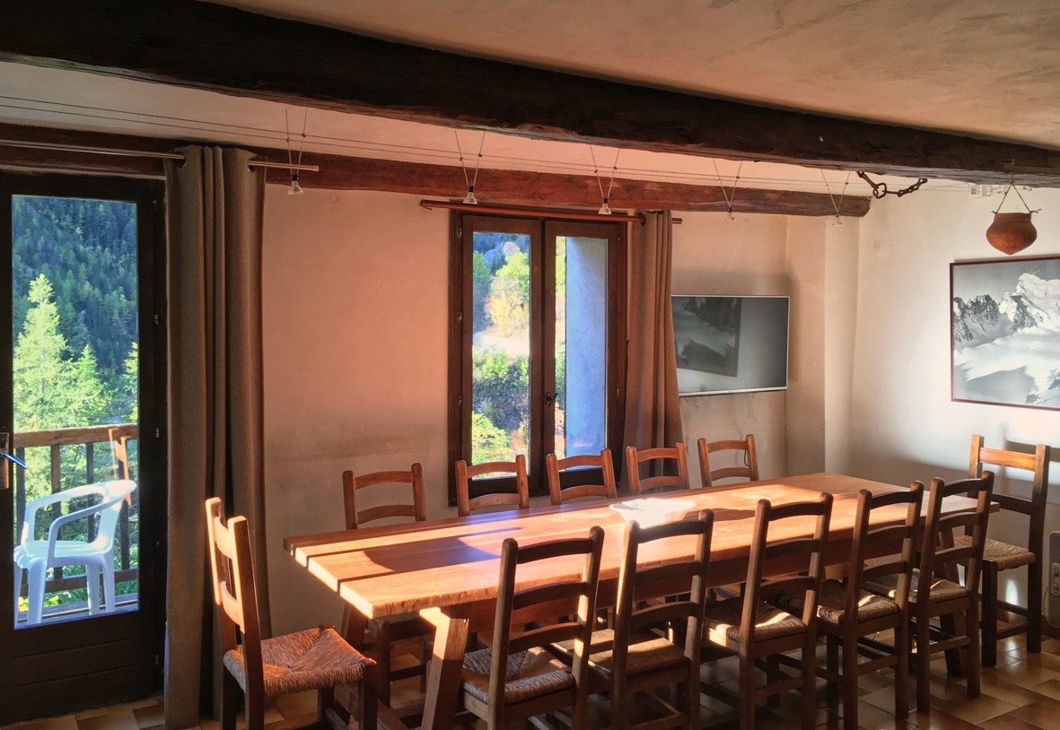 Grand séjour avec belle cheminée et mobilier rustique, balcon.Le premier étage offre 3 chambres dont une donnant sur une terrasse abritée idéale pour le petit déjeuner ou la sieste, avec vue exceptionnelle sur la montagne et jardin en contrebas.