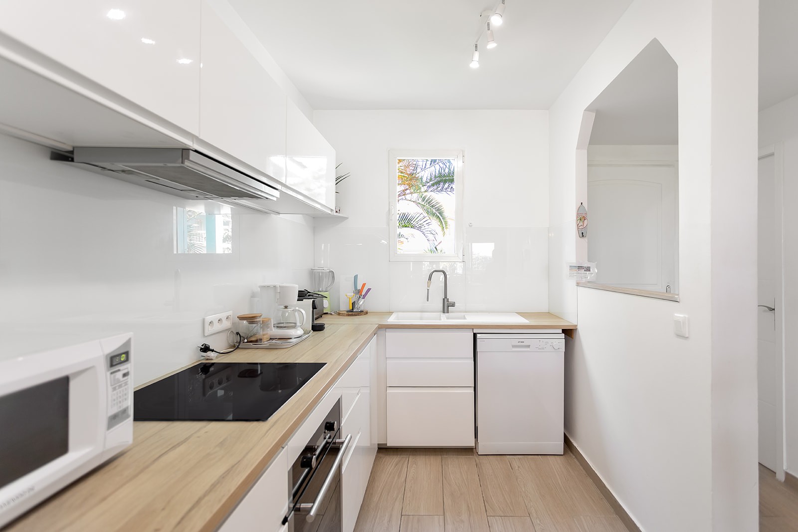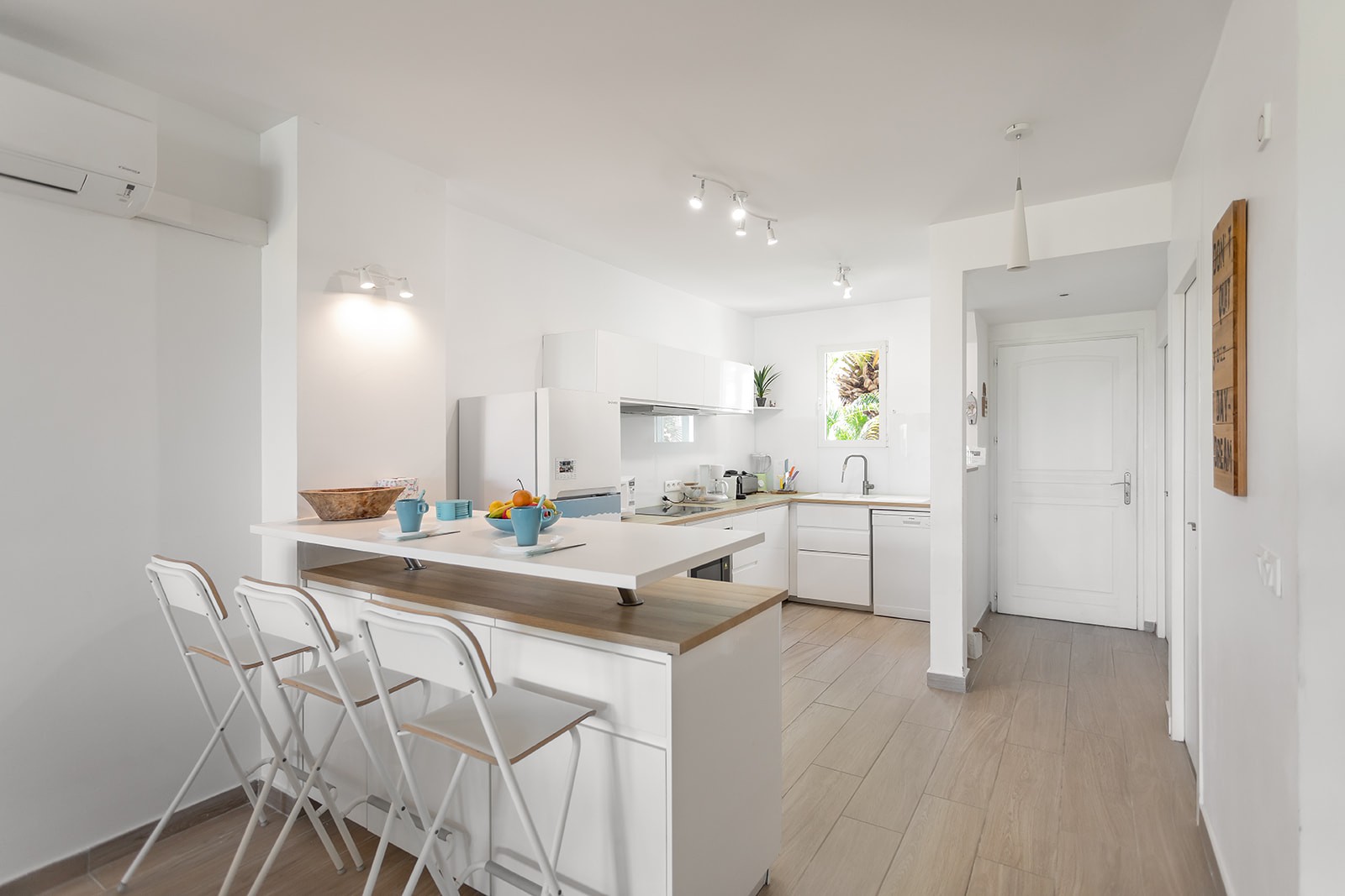 Au rez-de-chaussée, la pièce de vie lumineuse se compose d'une cuisine entièrement équipée et ouverte sur la salle à manger et le salon.