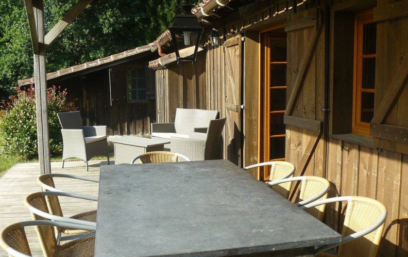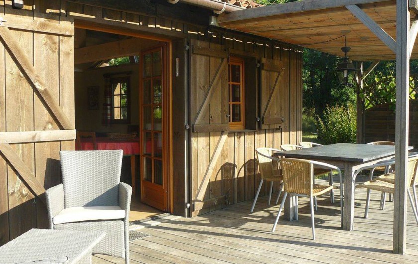 Grande terrasse en partie couverte, aménagée et située en plein soleil.