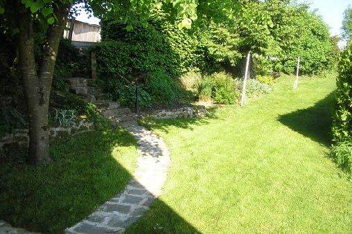 -1 cour fermée avec gazon puis terrasse aménagée d'un salon de jardin, d'un parasol, et d'un barbecue