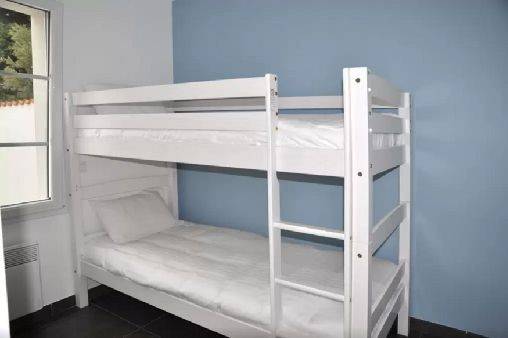 160 cm et grand placard de rangement, une chambre avec deux lits superposés de 90 cm et placard de rangement.