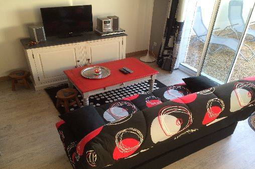 º Le salon, équipé d'un clic clac , table basse, TV grand écran, Lecteur DVD , bibliothèque avec livres et DVD