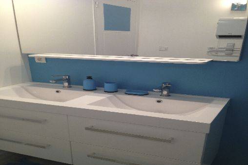 º Une salle d'eau avec double vasques, douche, sèche-serviette, wc, petit pot enfants, sèche cheveux et baignoire bébé.