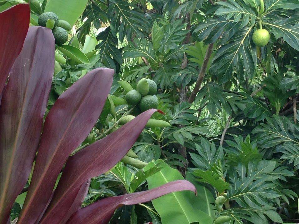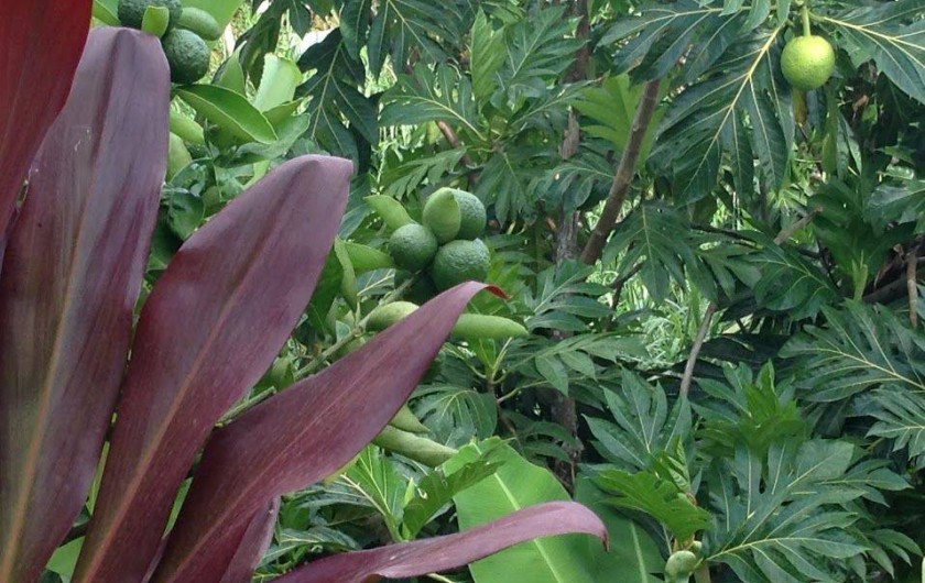 Jardin avec fleurs et arbres fruitiers : avocatiers, manguier, goyavier, bananiers, citronnier, cocotier...