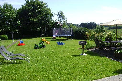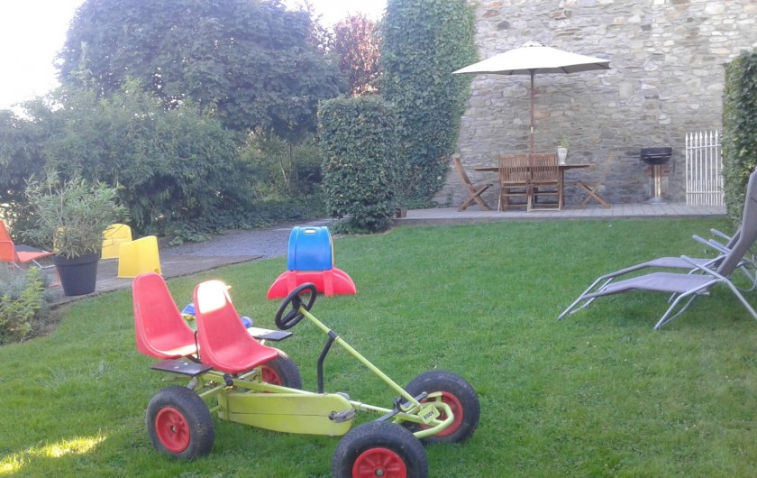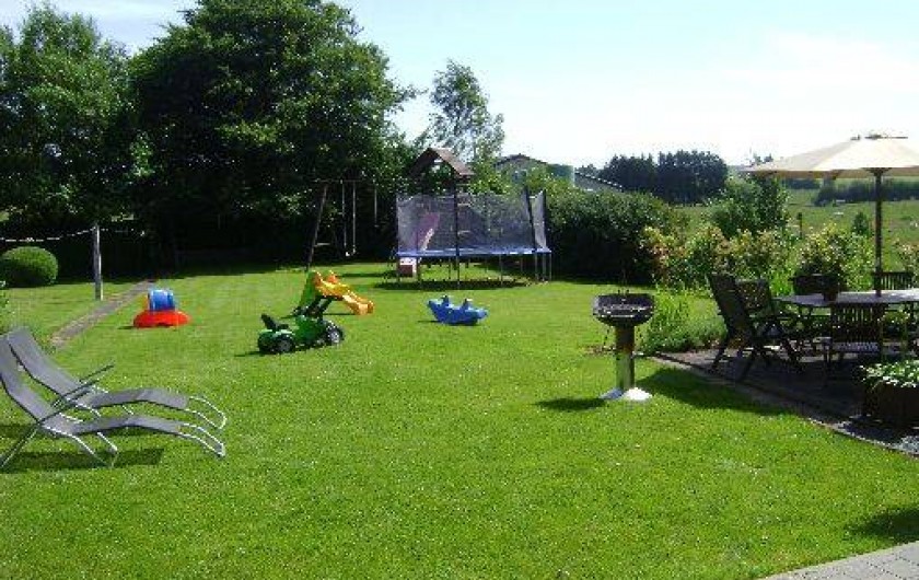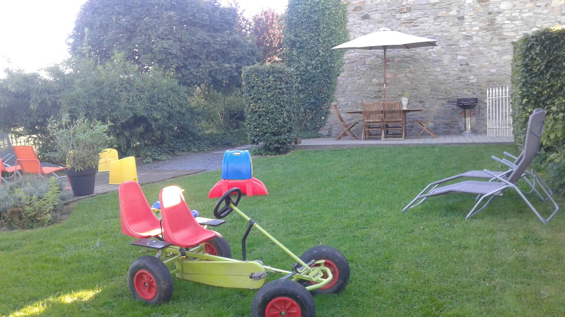 A l'extérieur, grand parking, petit garage avec tri poubelles, nombreux jeux enfants (tracteur,...)Grand jardin fermé,pelouse, trampoline, portique enfants avec balançoires et cabane perchée.