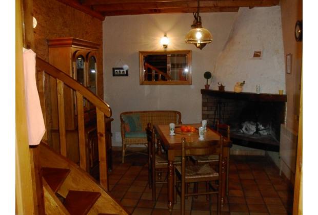 -salle de séjour rustique (poutres apparentes), cheminée d’angle, téléviseur, canapé rotin, vaisselier.