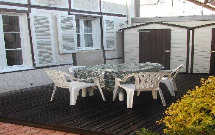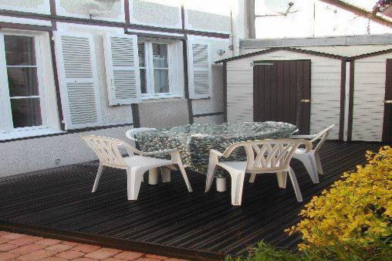 Son jardin privatif avec sa terrasse sont à votre disposition avec un cabanon pour les locataires avec matériel de plage pour enfants(seaux, pelles, ..) ainsi que parasol, table chaises de jardin, BBQ,