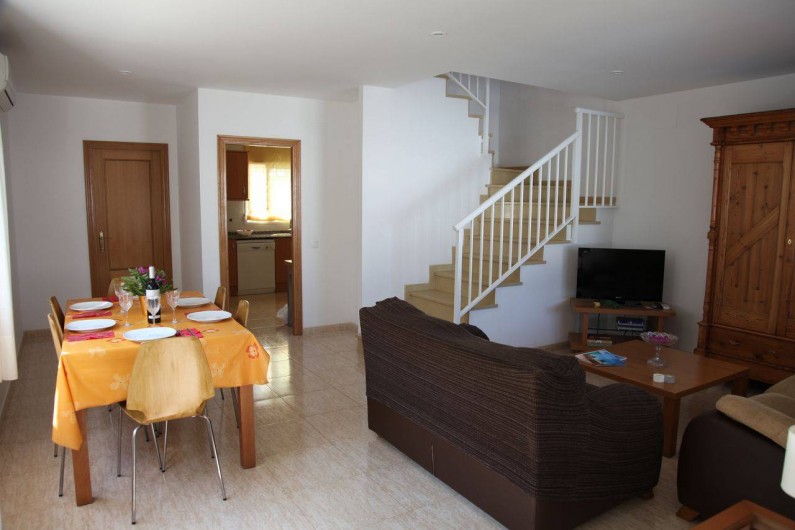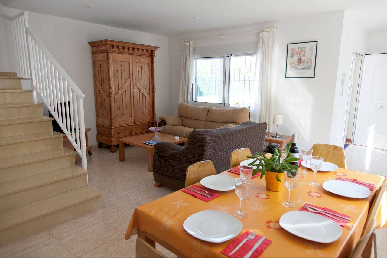 Au rez de chaussée est le salon avec une table à manger et 6 chaises, deux canapés et meuble avec TV a également une connexion de télévision par satellite.