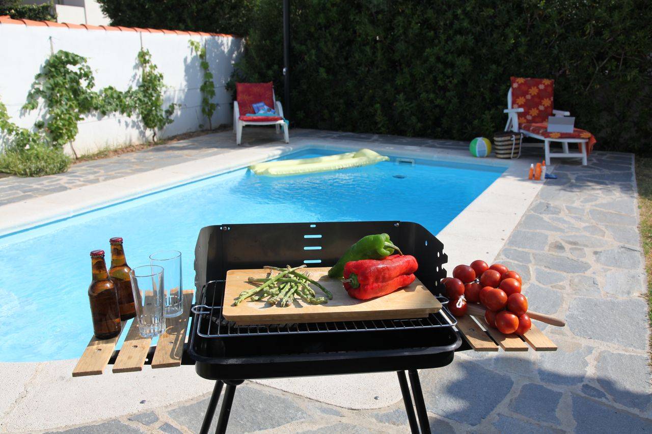 En extérieur, une terrasse couverte, piscine privée, jardin, barbecue et garage.