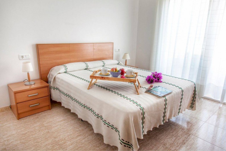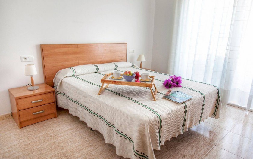 La chambre principale avec salle de bains dans la même pièce. Il dispose d'un lit double de 150x190cm , deux armoires et accès à la terrasse avec vue sur la mer.