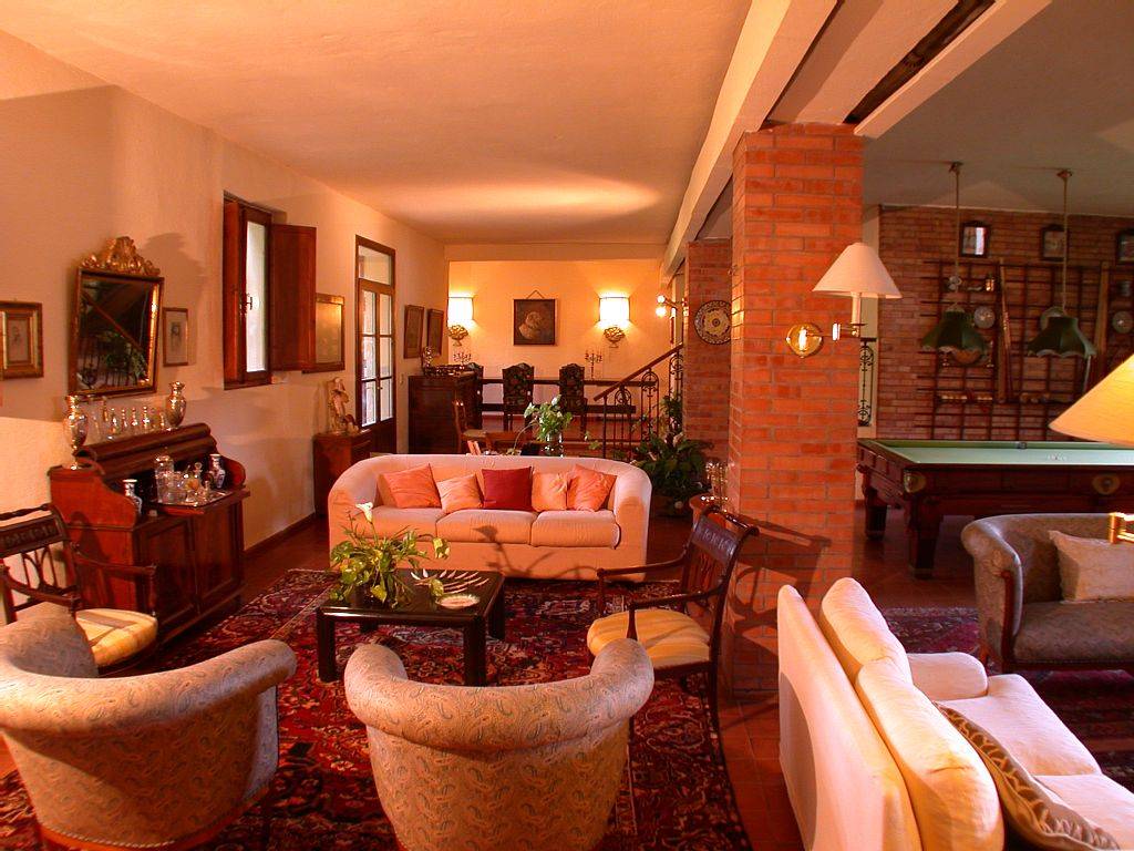 Tout la maison est décorée par meubles anciennes et modernes: dans le grand séjour plusieurs sofas et fauteuils disposée dans différents zones accueillent ceux qui souhaitent lire ou écouter de la musique; plus loin on peut jouer au billard. Au fond du salon la longue table de la salle a manger peut être mise pour 16 personnes.