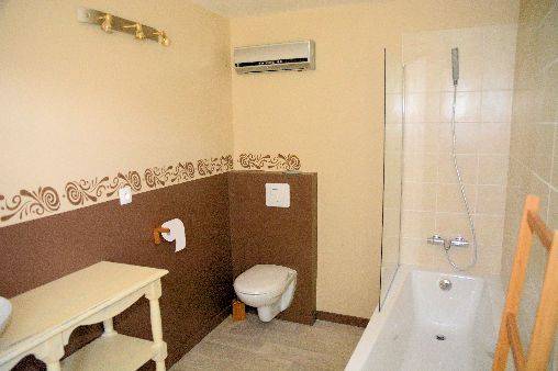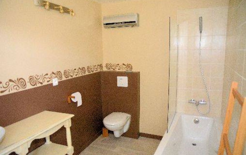 Une salle de bains avec baignoire, vasque et wc.