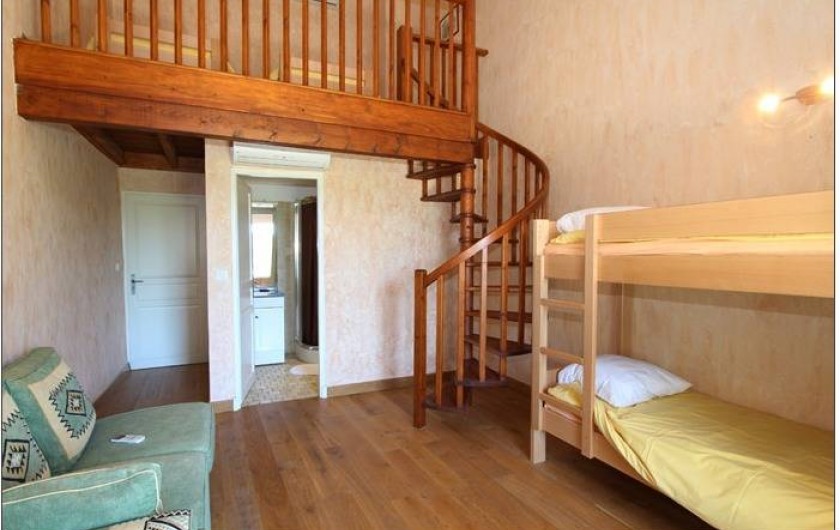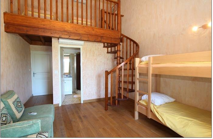 Chambre 3 : En mezzanine de hauteur confortable : Deux lits en 90. Deux lits superposés en 90 cm (le lit du haut ne convient pas à un enfant de moins de 6 ans). Une salle d’eau privative : Un lavabo simple vasque, une cabine de douche, un WC intégré.