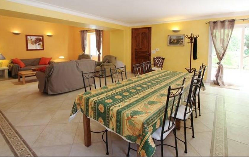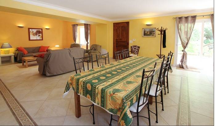 Salle à manger / Salon : Une table, huit chaises. Deux canapés 2 places. Deux fauteuils. Une télévision. Une cheminée. Une porte fenêtre avec accès au jardin.