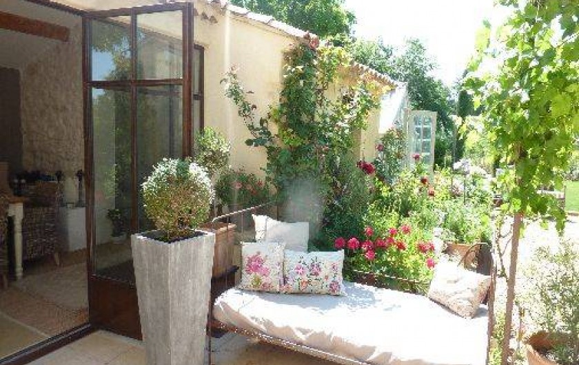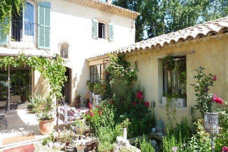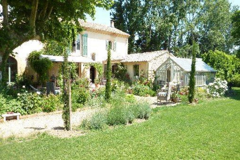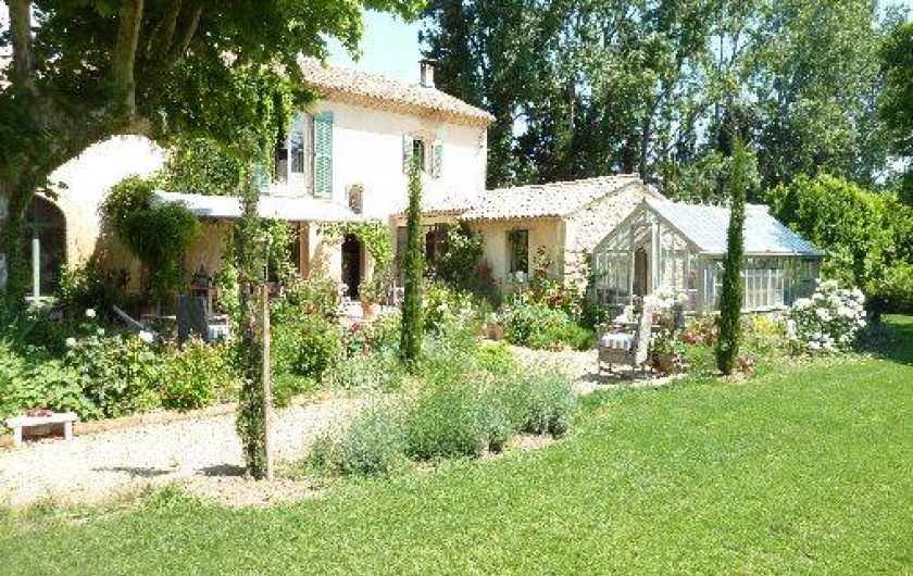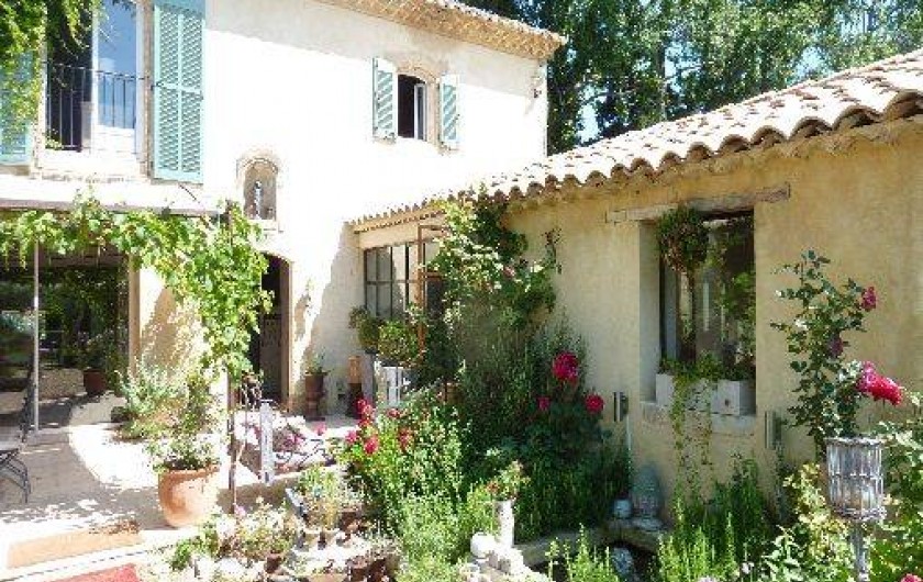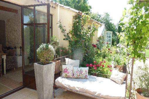 pelouse, beaucoup de fleurs et d'herbes qui parfumeront vos délicieux repas, grande terrasse, ombragée, platane centenaire...