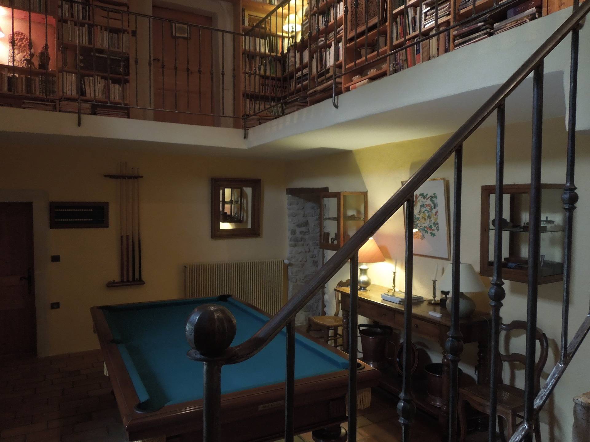 Un salon TV avec cheminée, un autre avec billard et bibliothèque en mezzanine, une salle à manger avec TV, une salle de jeux avec ping pong, une salle à manger d'été voûtée, sont à votre disposition.