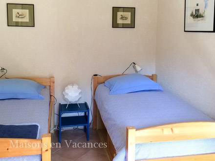 chambres dont 1 chambre avec 1 lit double 140 cm, 1 chambre avec 1 lit double 140 cm, 1 chambre avec 2 lits simples 90 cm. Totalité des sanitaires : 2 salles d'eau, 2 wc. Séjour-salle à manger de 25 m2 avec cheminée. Hifi, accès internet sans fil Wifi. Coin cuisine avec : réfrigérateur, réfrigérateur congélateur, congélateur, plaque de cuisson à 4 feux, four à micro-ondes, lave-vaisselle, lave-linge. La propriété parfaitement privative est composée de 2 petites maisons qui communiquent par le jardin : 1 avec séjour, cuisine, 1 chambre double, salle d'eau et wc. Une avec une chambre double et une chambre d'enfants, salle d'eau et wc.