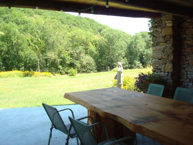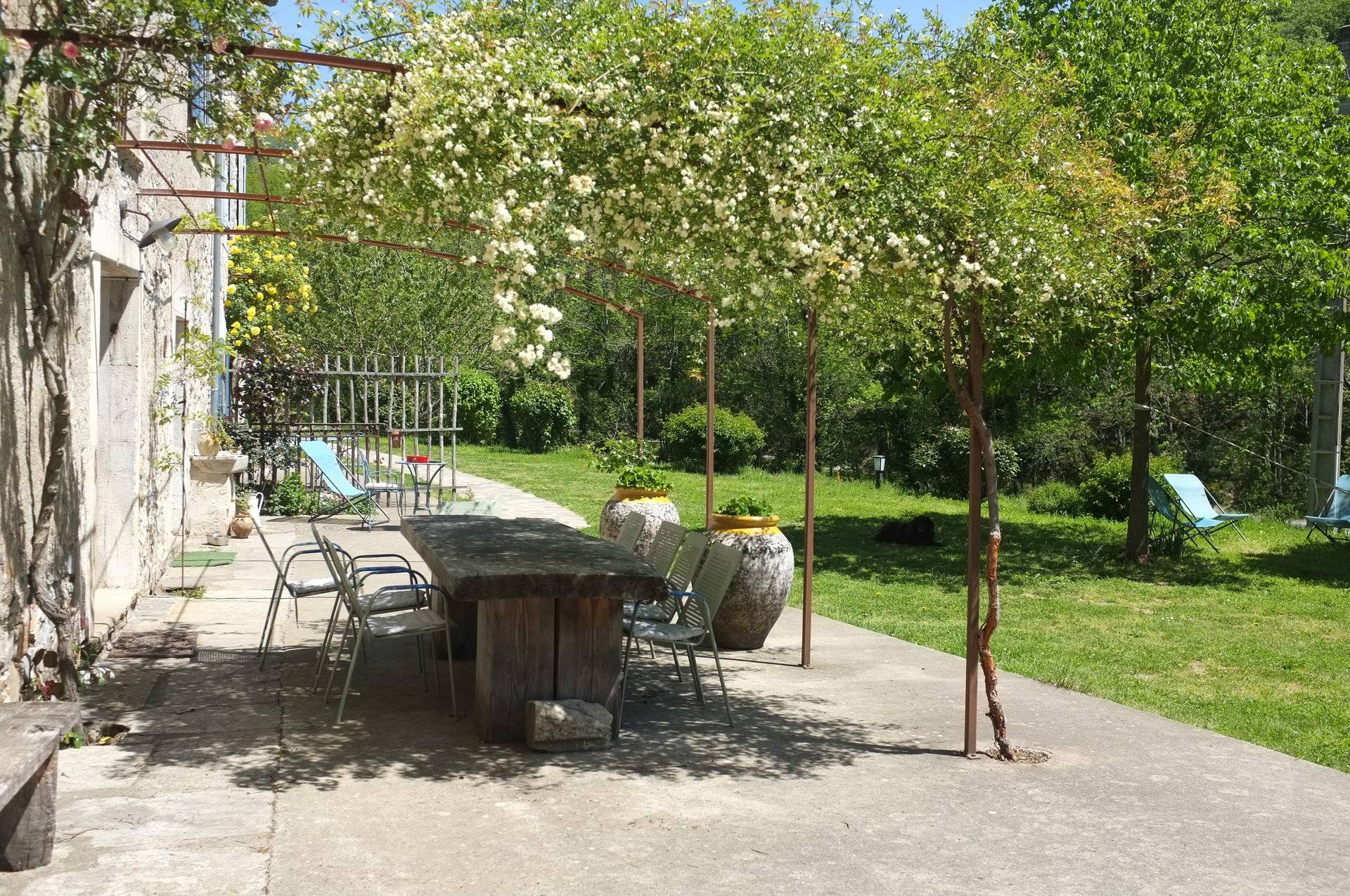 sud/est) ouvre sur un jardin ensoleillé. Ombrage assuré par de grands arbres. Transats et mobilier de jardin permettent de profiter de cet espace. Un préau couvert avec tables et chaises vous permet de manger dehors même en cas de temps gris.