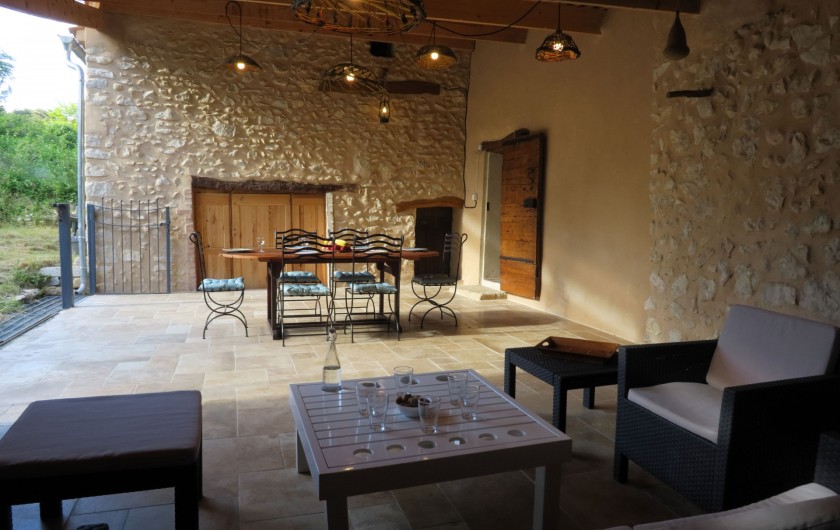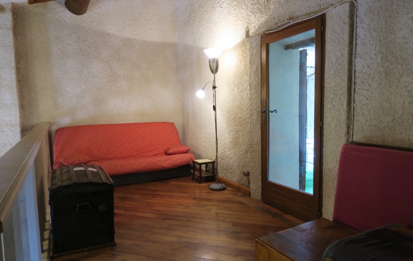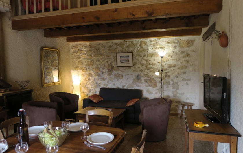 Grand séjour cuisine avec mezzanine, canapé et coin lecture en rez de jardin haut donnant accès à la terrasse couverte et au jardin.