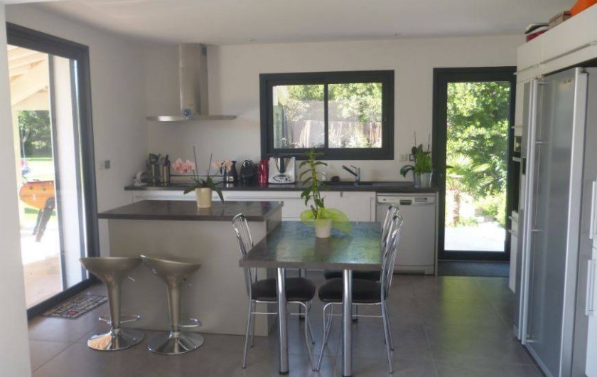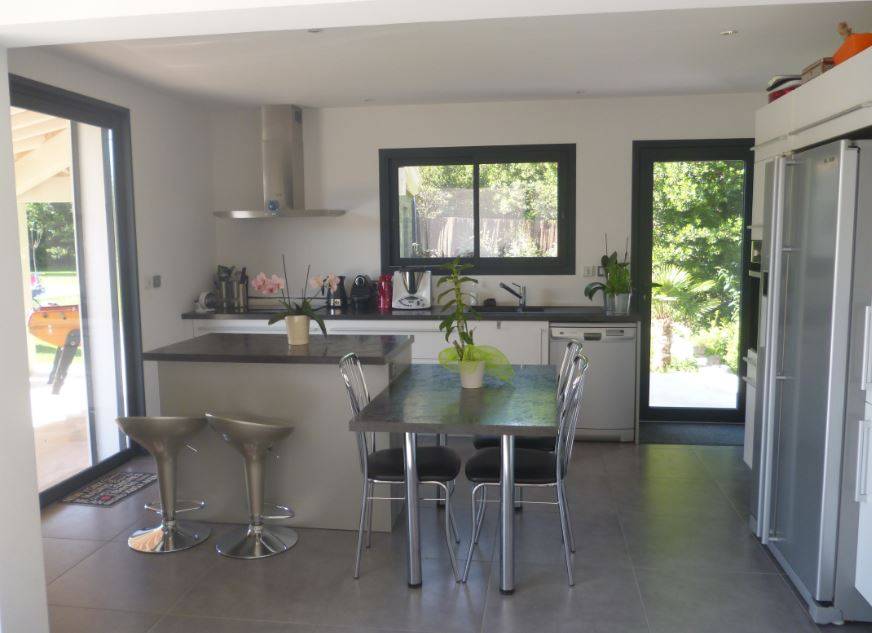 La pièce principale (salon, salle à manger) s'ouvre sur une grande terrasse couverte et sur la piscine et sur le jardin paysagé. La cuisine américaine est équipée d’un frigo américain donnant sur la terrasse.