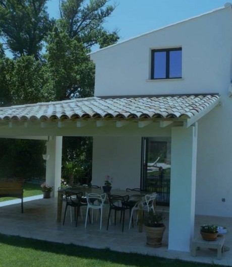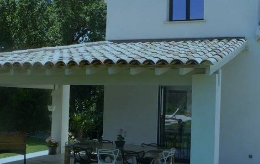 En extérieur vous trouverez une grande terrasse couverte (table en teck et fauteuils) permettant de prendre l'ensemble de vos repas face à la piscine.