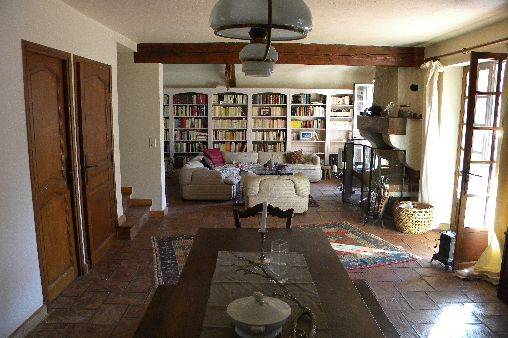 Au rez-de-chaussée: grand living avec cheminée ouverte donnant sur une première terrasse couverte, cuisine équipée donnant sur la seconde terrasse couverte, une chambre avec un lit gigogne, une salle d'eau