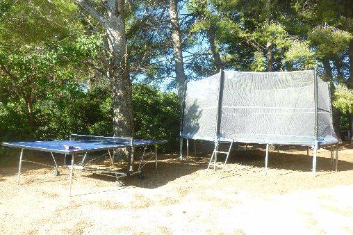 Il est équipé d'une piscine hors-sol en bois de 10m², d'un grand trampoline et d'une table de ping-pong.