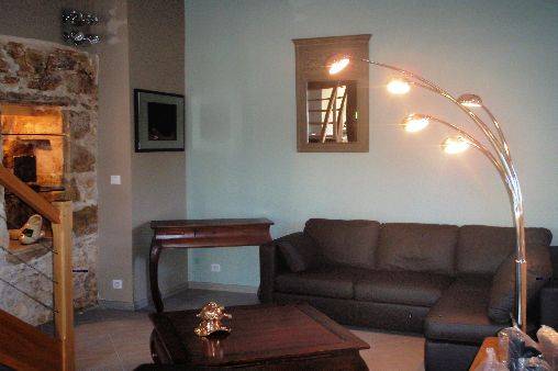 Cette grande pièce à vivre vous offre un canapé d'angle en cuir, un home-cinéma, un écran plasma de 107 cm, une bibliothèque, une cheminée au bioéthanol.