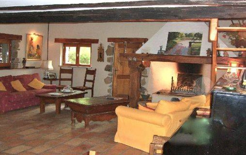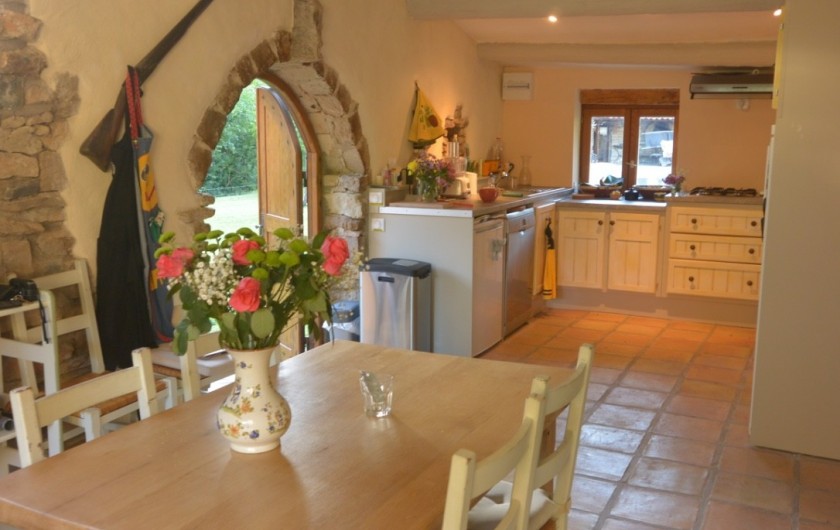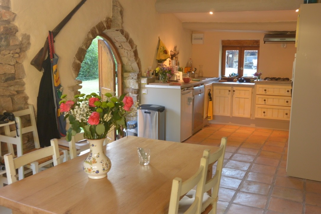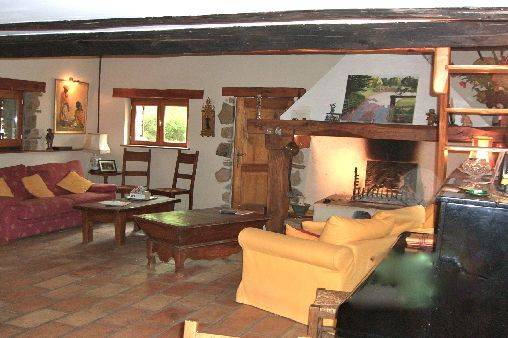 Un grand séjour avec belle cheminée en pierres, une cuisine toute équipée - four, four micro, lave vaisselle, frigidaire, congélateur et plaque de cuisson -, une salle de télévision/salle de jeux