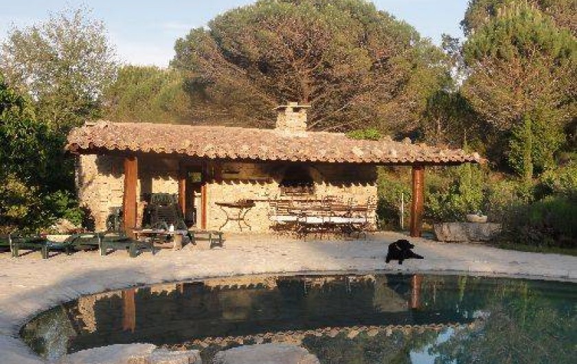 Côté piscine il y a une superbe cuisine d'été équipée d'assiettes, lave vaisselle, plaque de cuisson et frigidaire, avec barbecue dans cheminée en pierre et du beau mobilier de jardin: table et chaises longues.