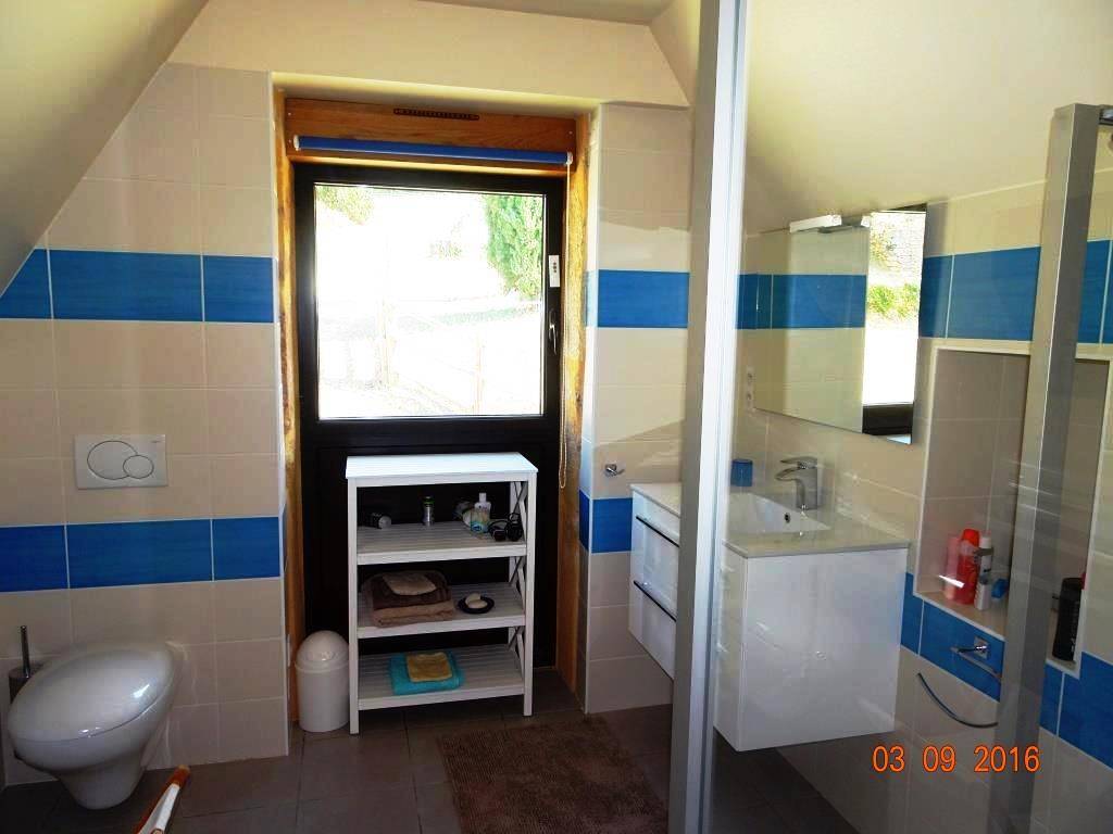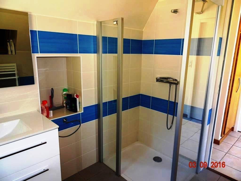 Sol en carrelage au rez de chaussée et dans la salle d'eau, parquet dans la chambre à l'étage