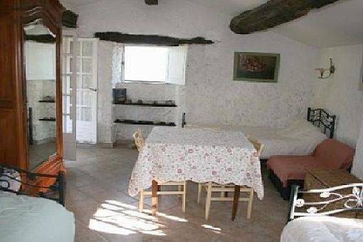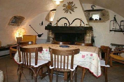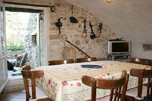 - le séjour (l’ancienne petite bergerie de 24 m2, voûtée avec sa crèche) est équipé d’une cheminée, une table extensible, un buffet, deux fauteuils (avec TV – TNT – lecteur DVD, téléphone).