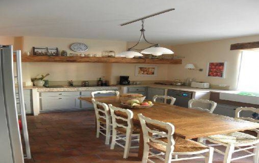 Cuisine équipée avec frigo US grande capacité, lave-vaisselle, 6 plaques à induction, four micro ondes et équipement petit électro ménager complet, table de cuisine de 10 couverts.
