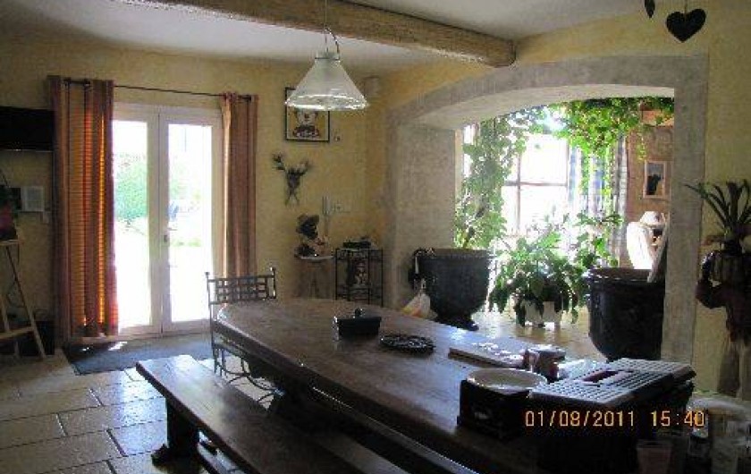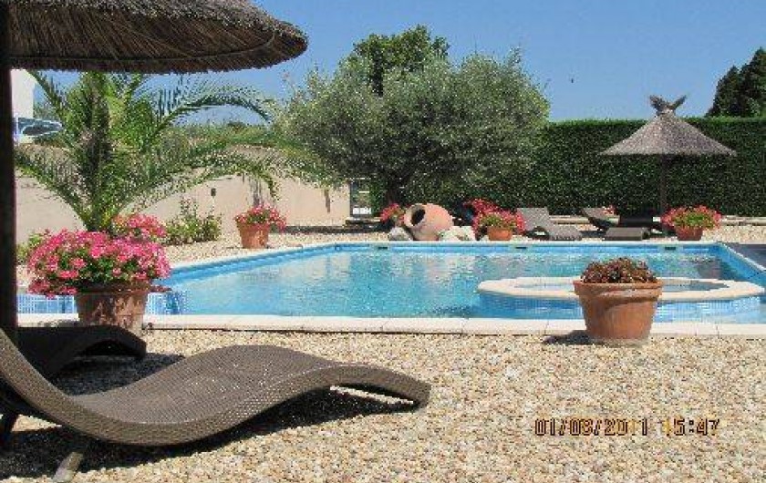 En extérieur, terrasse sous platane centenaire équipé de table et chaises en fer forgés. Jacuzzi dans le jardin. Barbecue et four à pizza. Parking couvert (2 voitures).