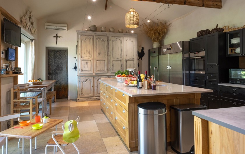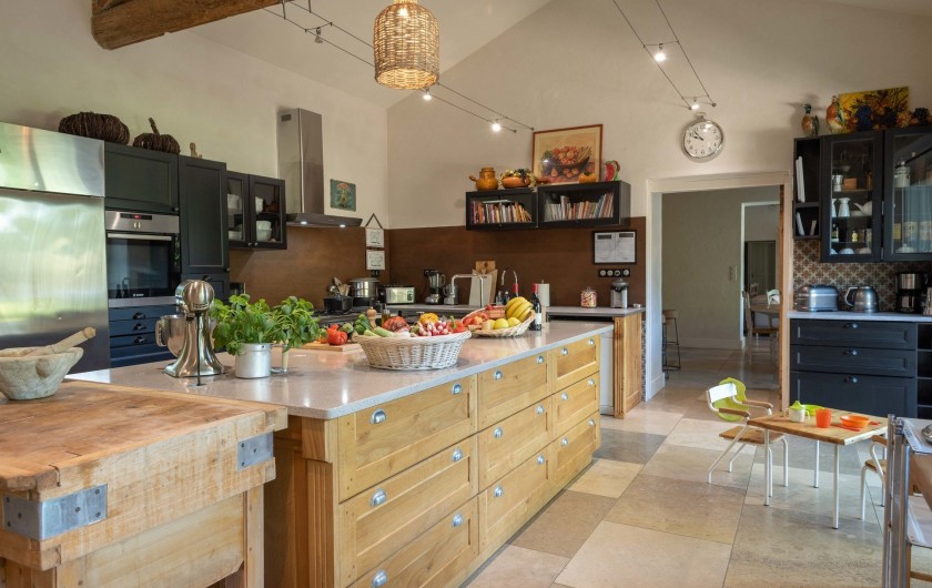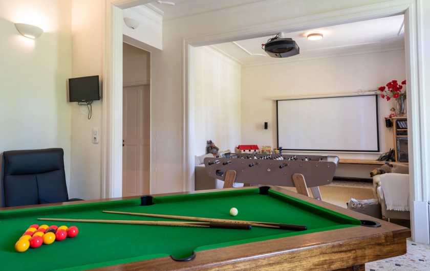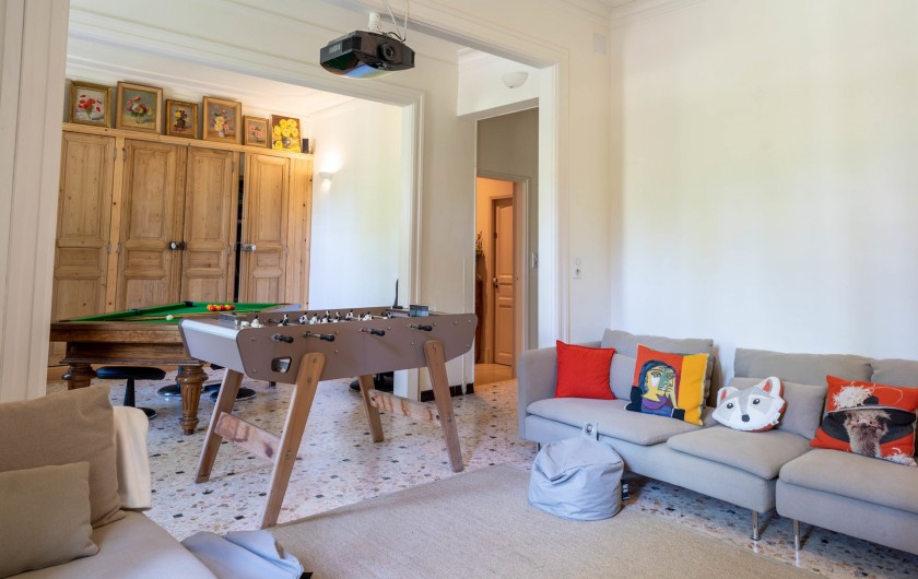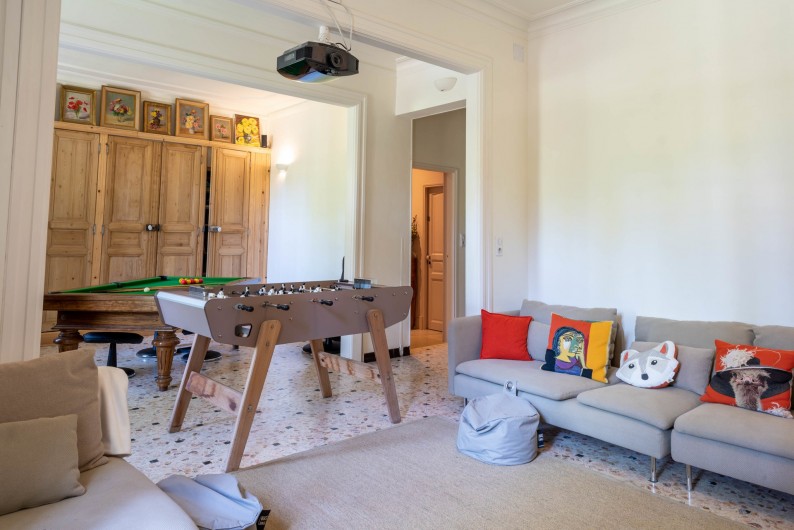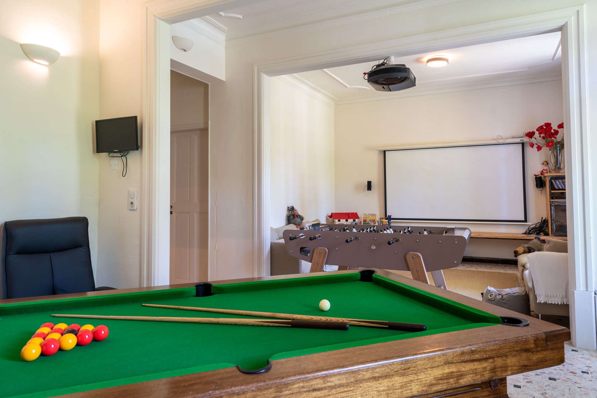 cuisine semi professionnelle avec un grand ilot central, un deuxième salon pour les enfants avec jeux, baby foot, billard, home cinéma.