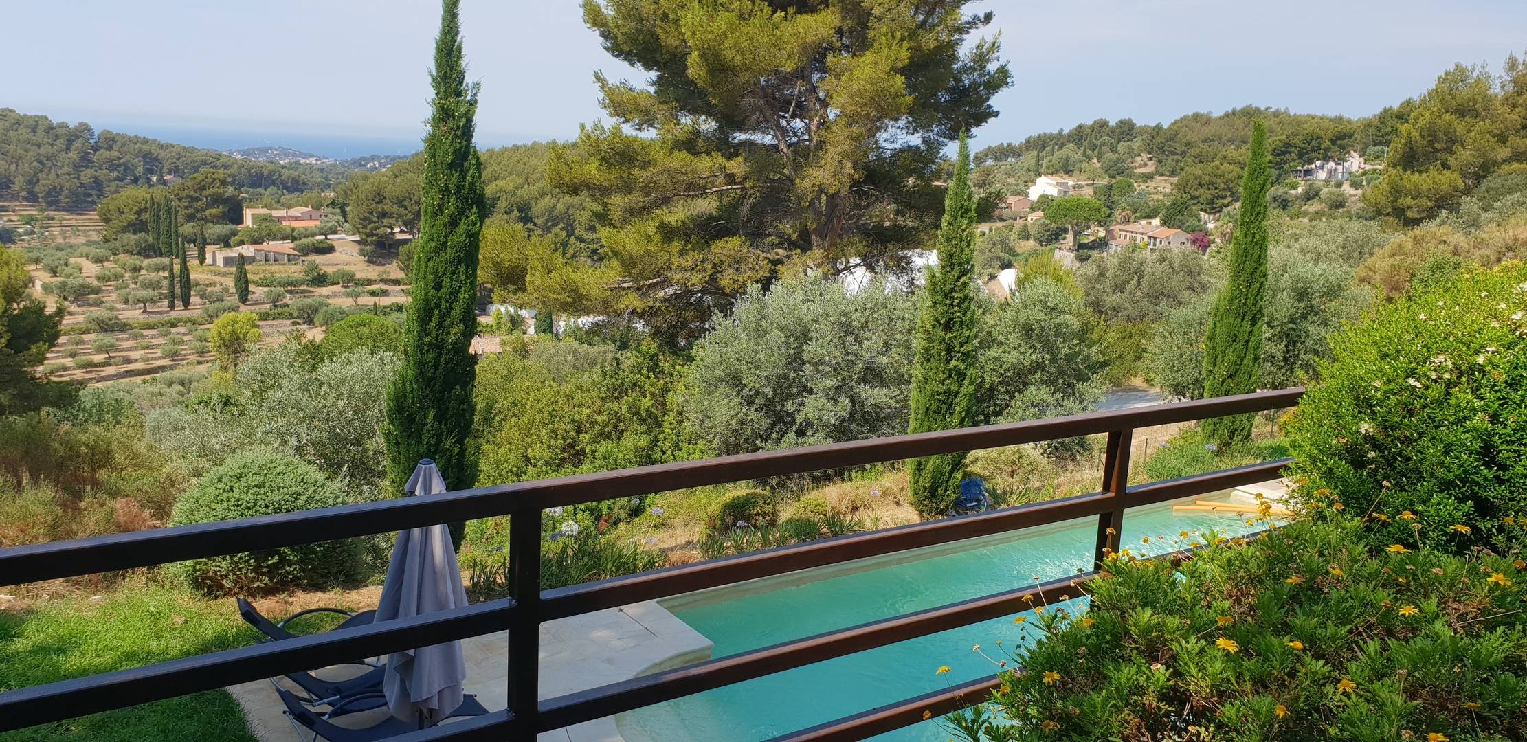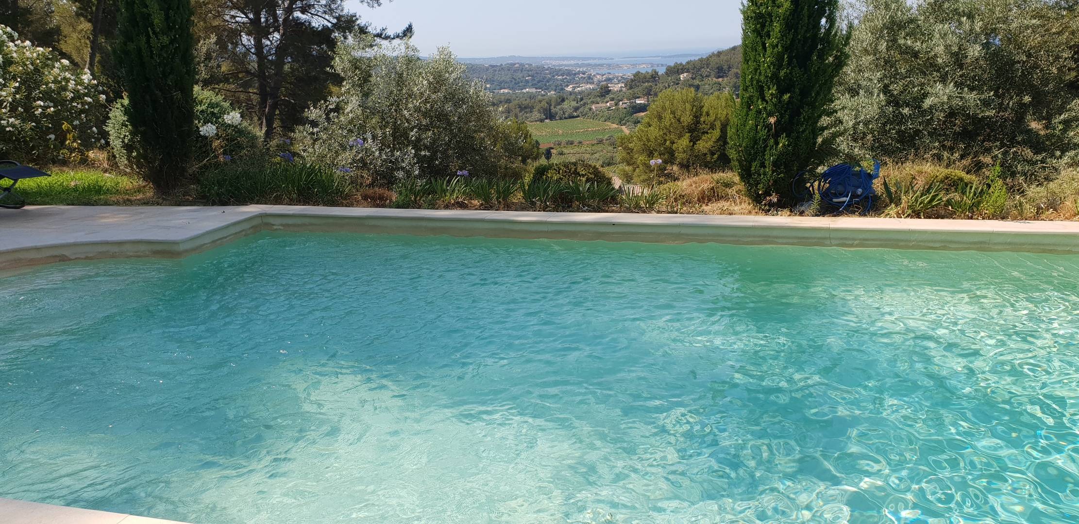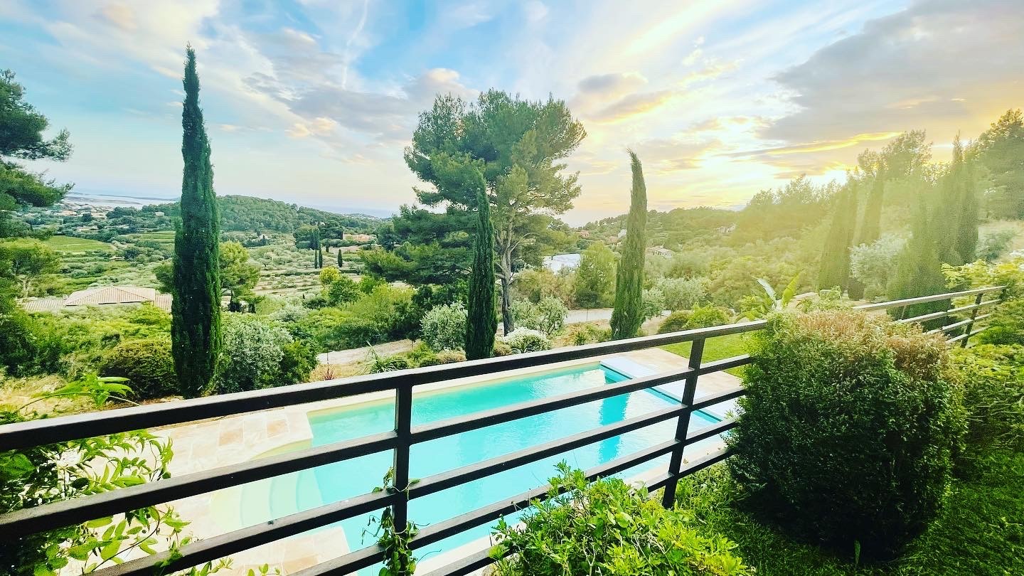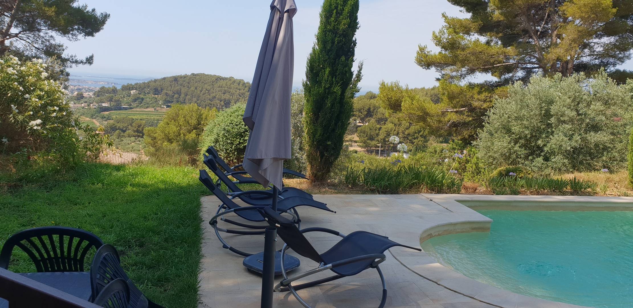 MAGNIFIQUE VILLA 10 PERSONNES VUE MER SPLENDIDE AVEC TRES BELLE PISCINE, ON EST SUR UN PRODUIT PREMIUM 5chambres composées de 3 suites et 2 chambres avec 1 salle de bain. terrain situé au milieu de la pinède au grand calme, très grande terrasse ombragée avec vue mer et sur le vignoble de bandol. Grande cuisine, salon à part et belle salle à manger. Piscine 5 par 10, Plage à 4kms.