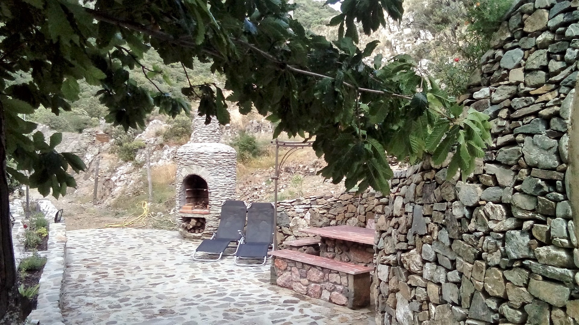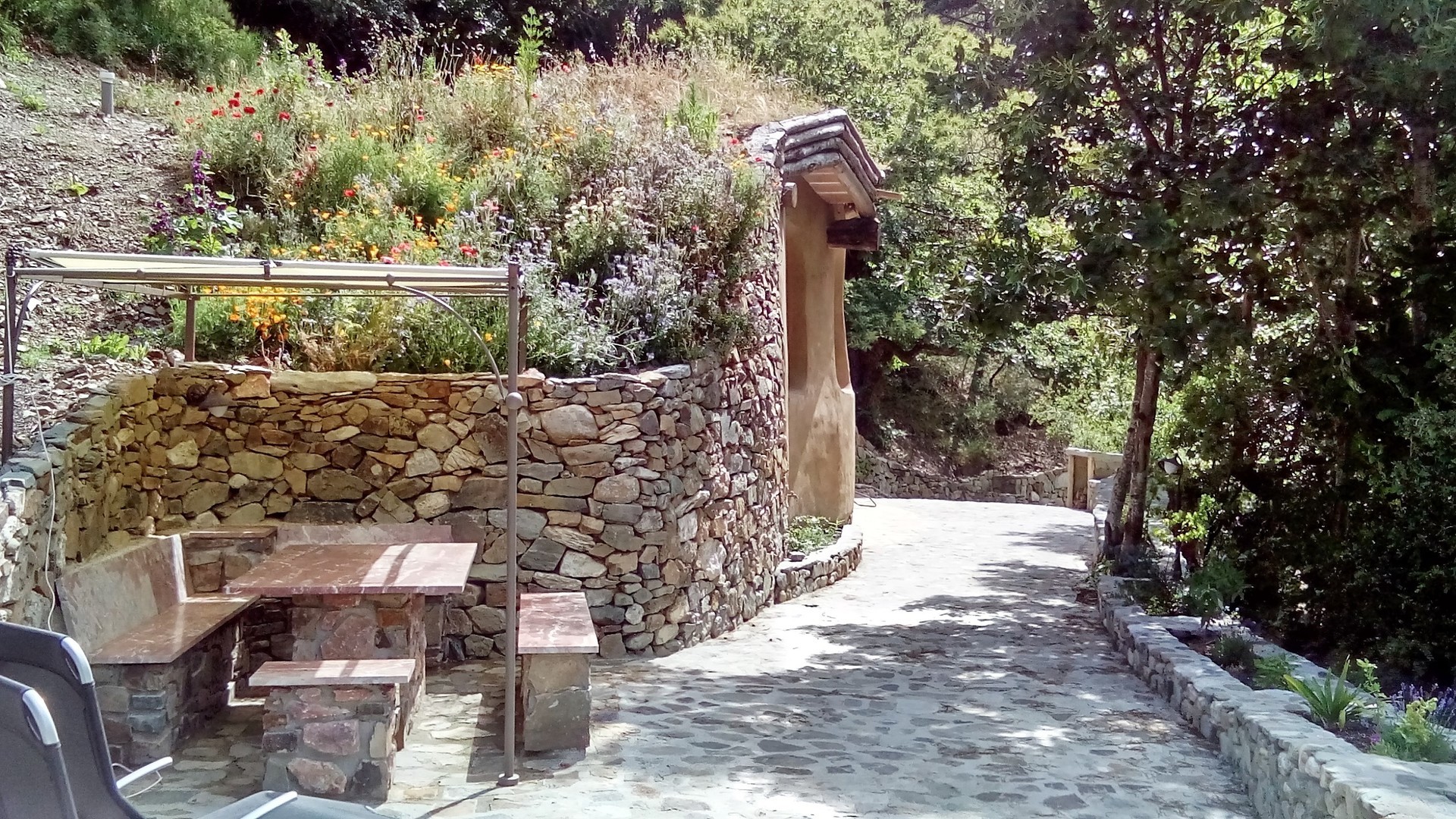 Devant la maison de Hobbit, vous trouverez une magnifique terrasse panoramique avec table et bancs en marbre rouge de Caunes et à deux pas, un barbecue à l’ancienne, digne d'un banquet médiéval.