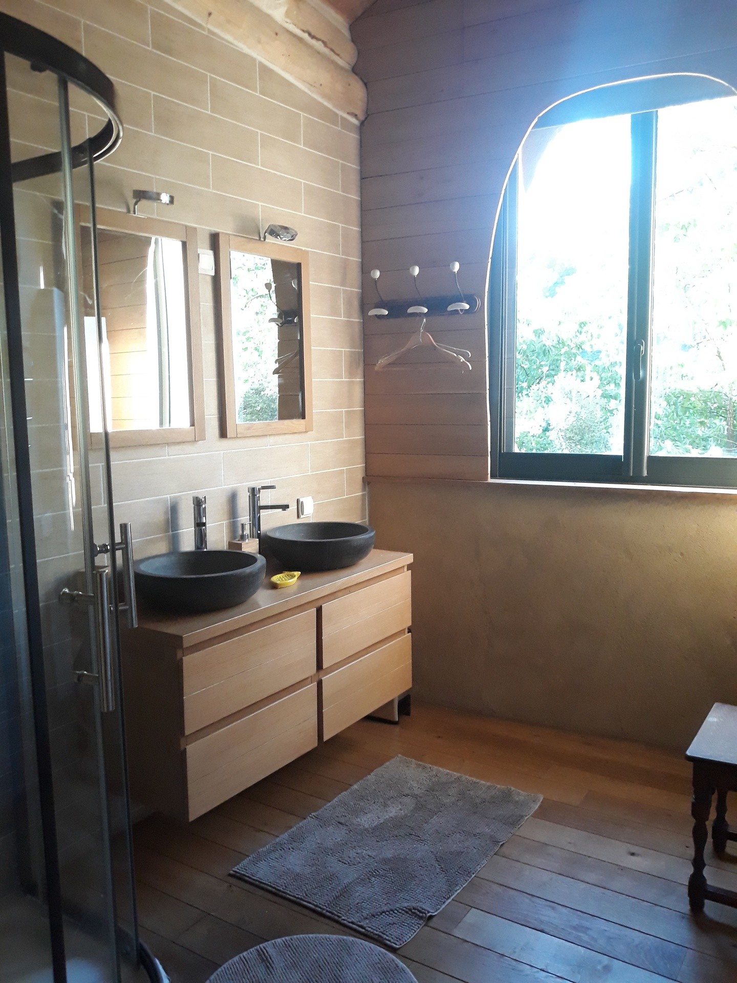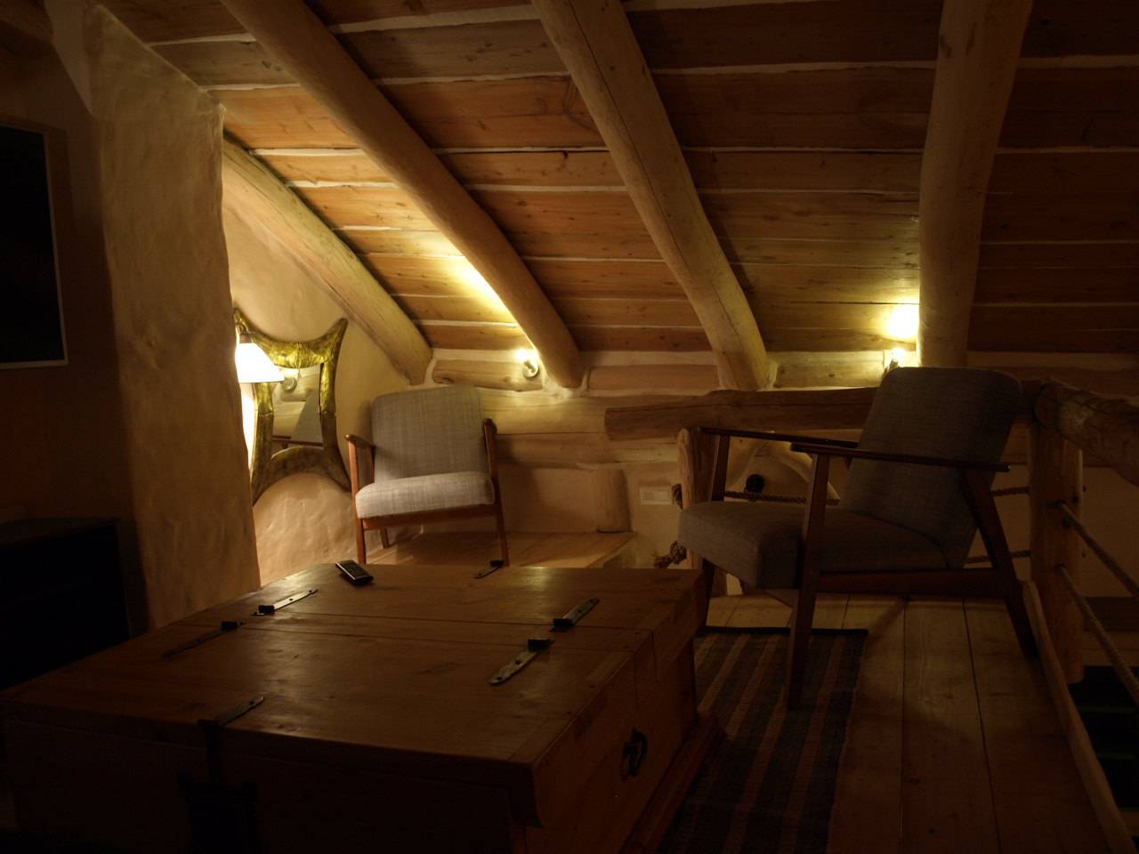 La maison de Hobbit peut accueillir au maximum 8 personnes dont 3 enfants ; d'une superficie de 65 m², elle présente tout le confort. En été, la fraîcheur est toujours présente et en hiver la chaleur fournie par un poêle à bois est douce et agréable grâce à l'encavement de la maison. Deus chambres dont une avec 2 lits simples sur la mezzanine en plus du grand lit de 160 cm et l'autre avec un lit simple sur la mezzanine. TV, canapé convertible, lave-vaisselle, lave-linge, douche à jet.