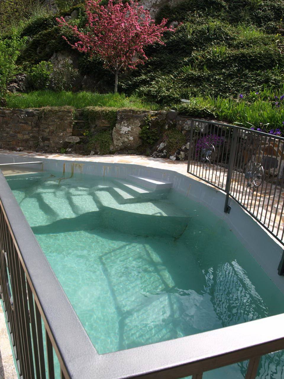 La piscine de 4m sur 10m , chauffée à partir de avril jusque fin septembre et traitée au sel vous offre une eau entre 25 et 28 degrés mais vous pouvez préférer la piscine naturelle, sans adjonction de produits, alimentée par l’eau de la rivière mais à l’eau ... fraîche ( de 19 à 23 degrés en été ) . Cette dernière est accessible durant les mois de juillet et août.