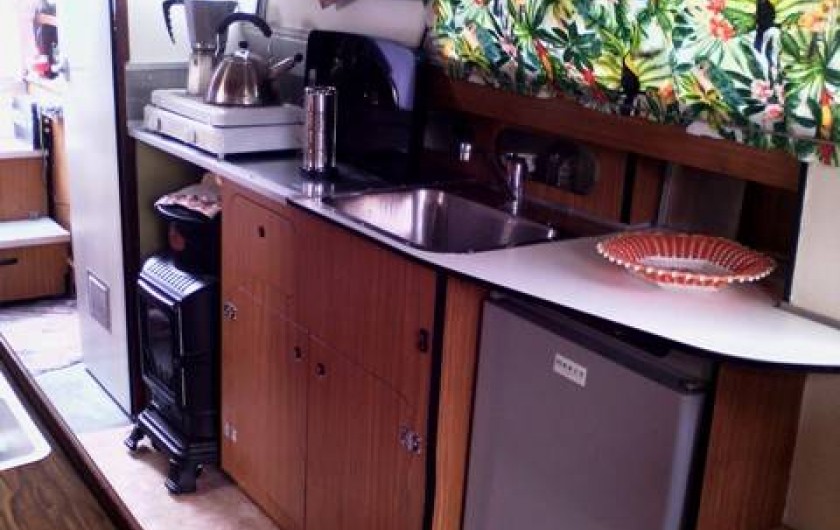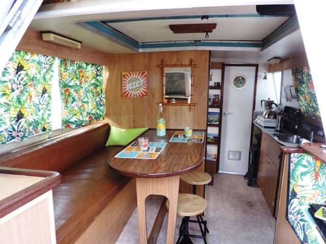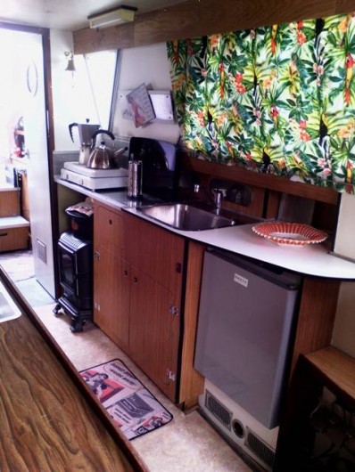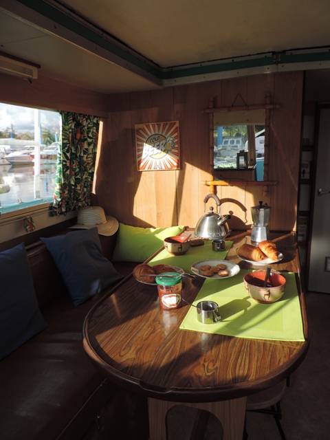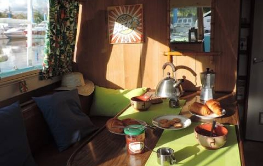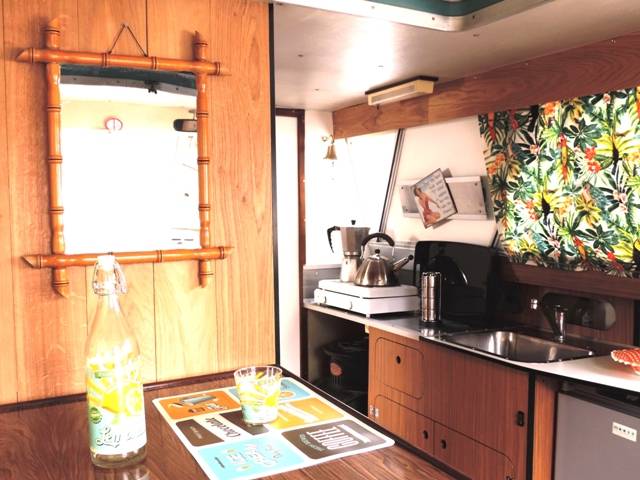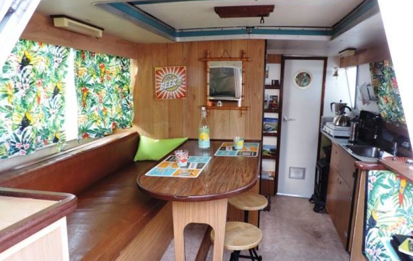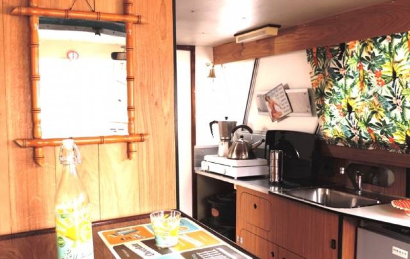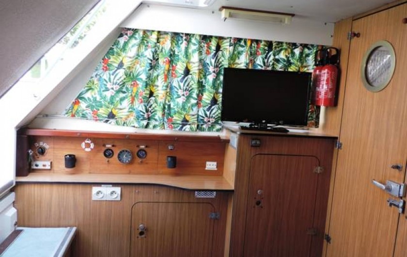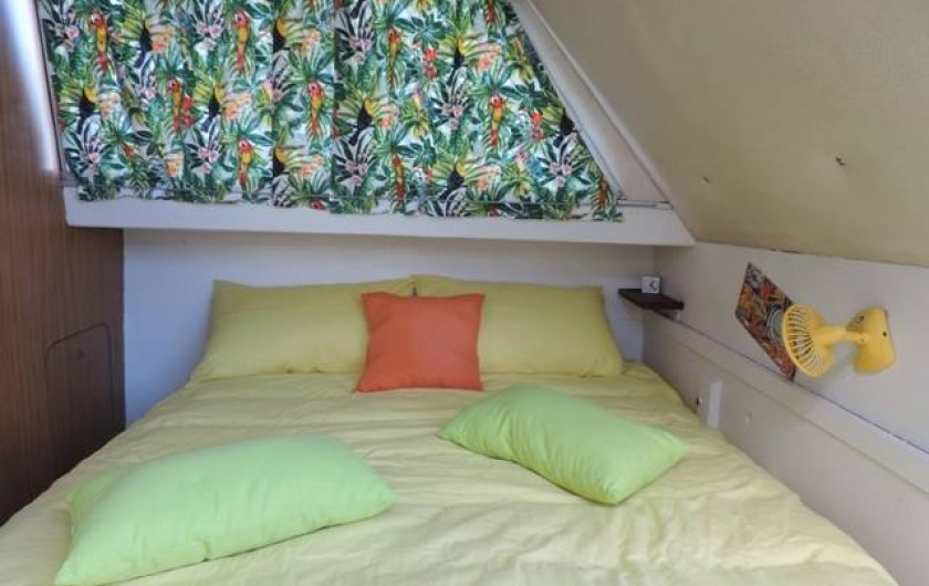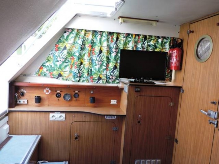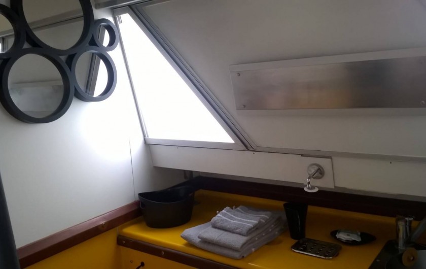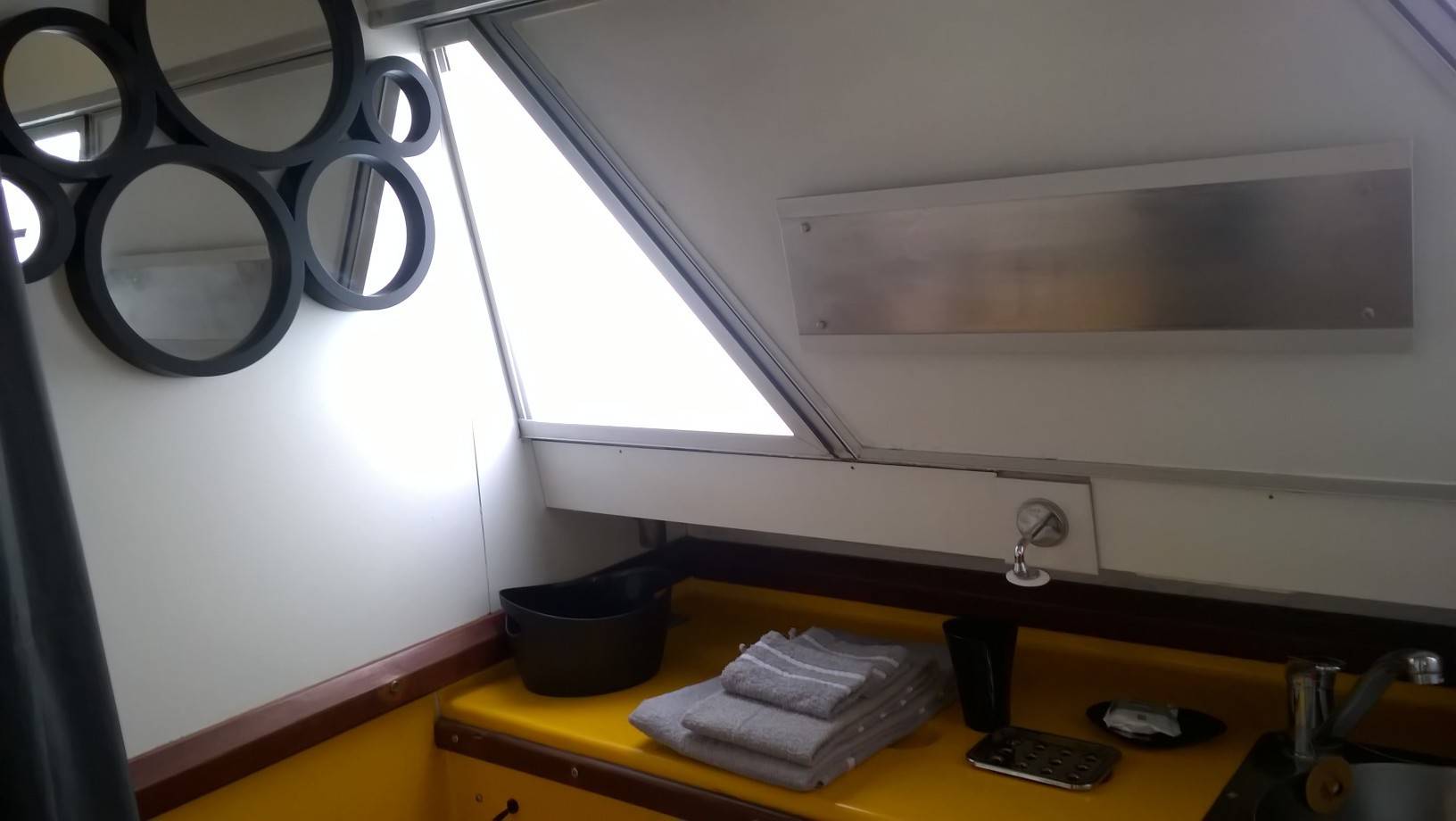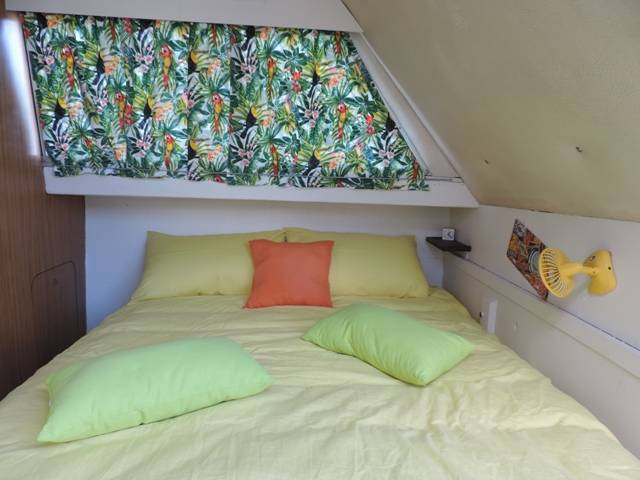 Équipement : une chambre lit 140x190 avec accès au pont, coin dinette, WC, douche, chauffage électrique, couchage additionnelle 140x190, deux vélos, écran TV, WIFI.