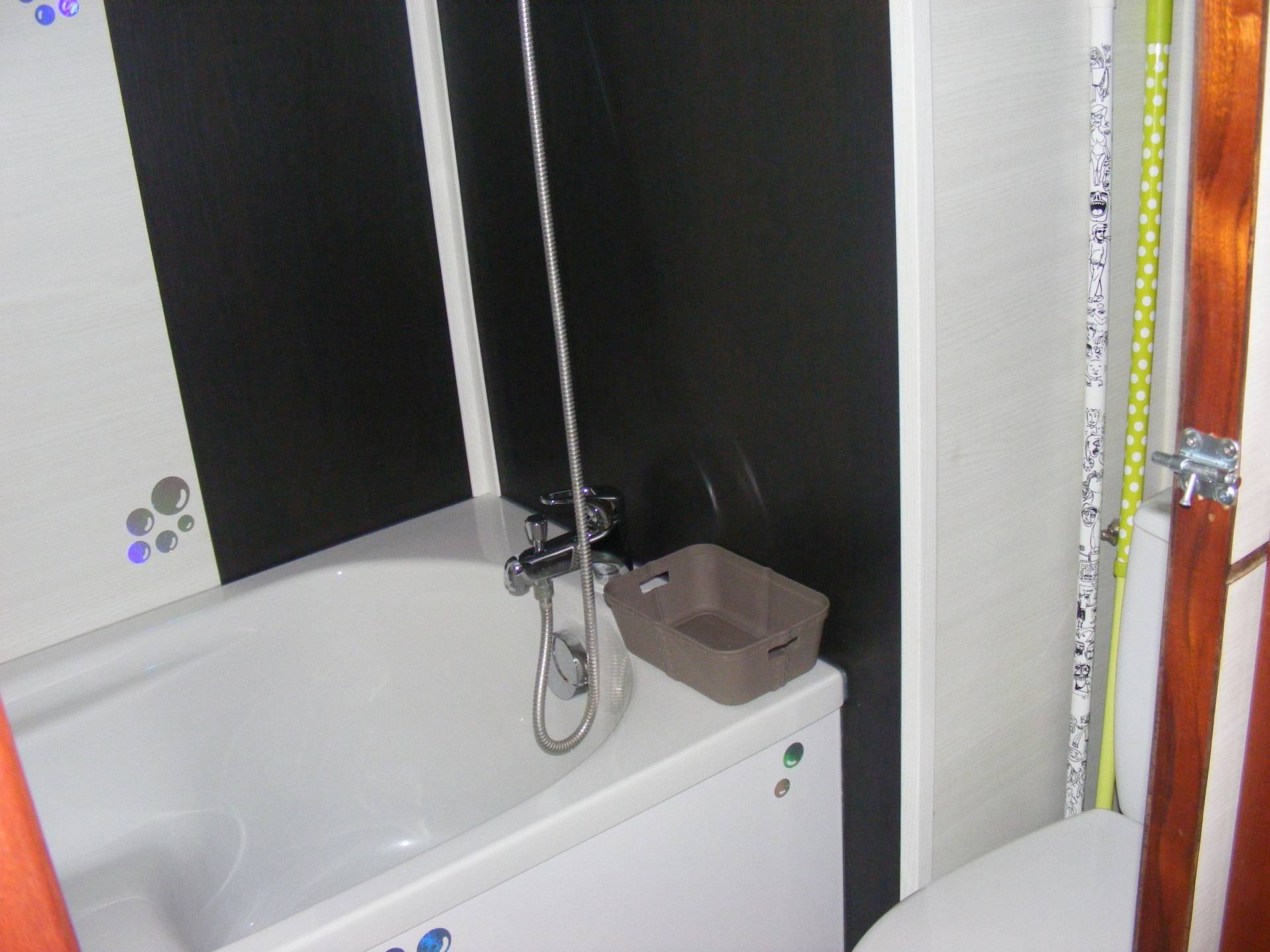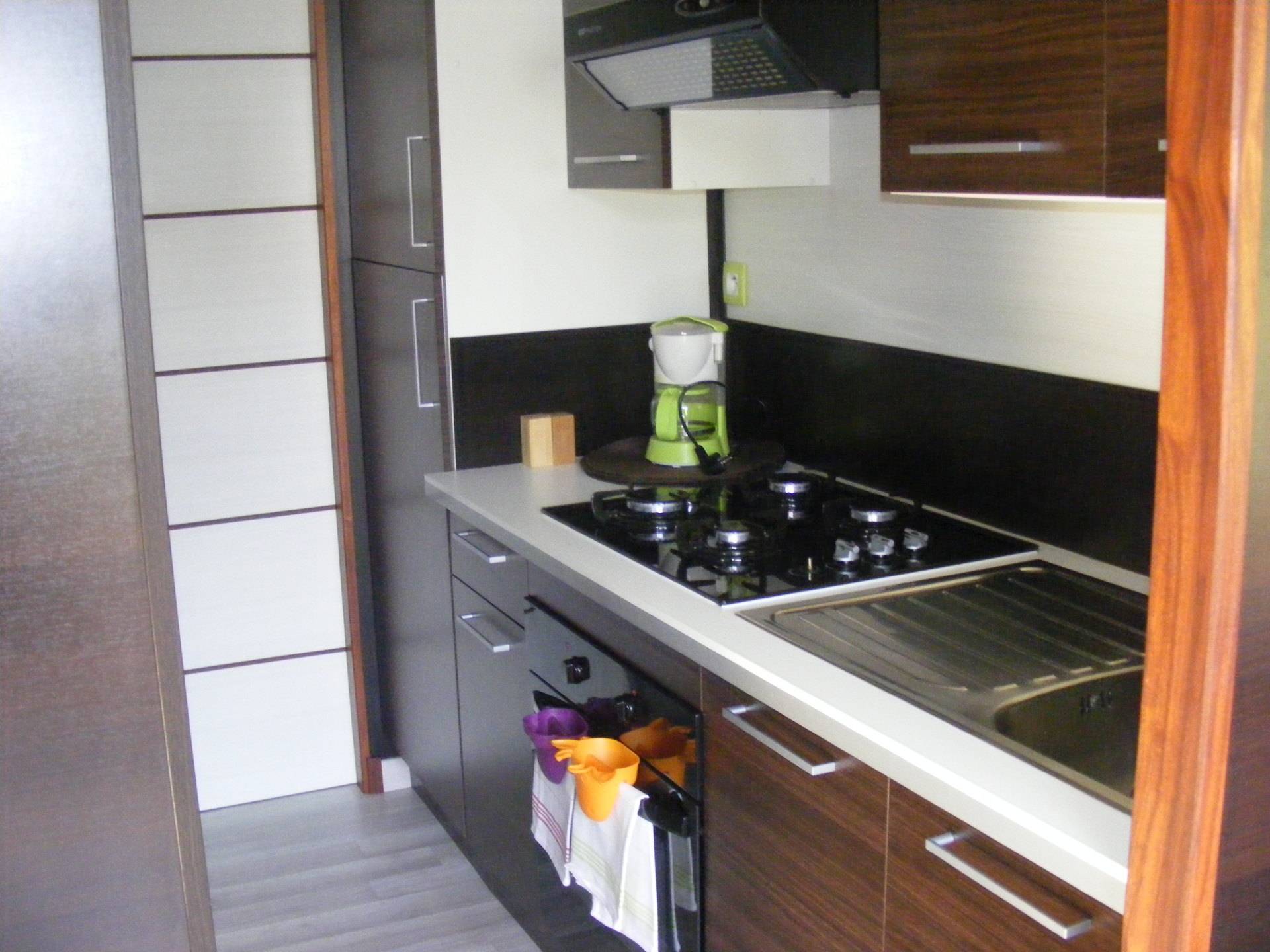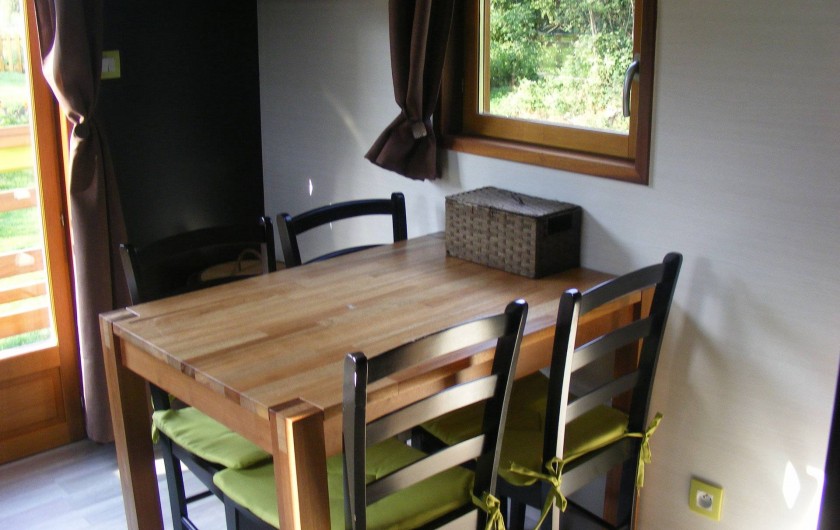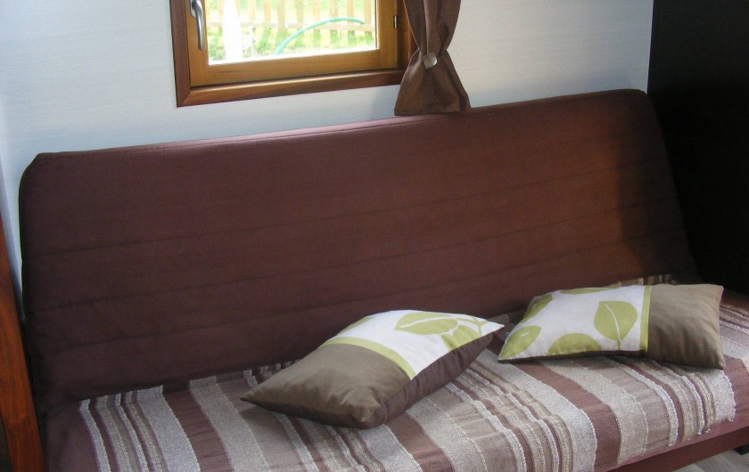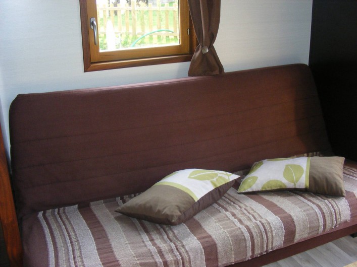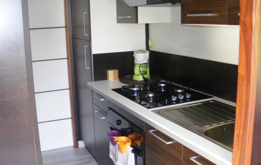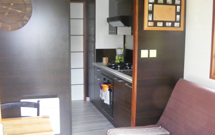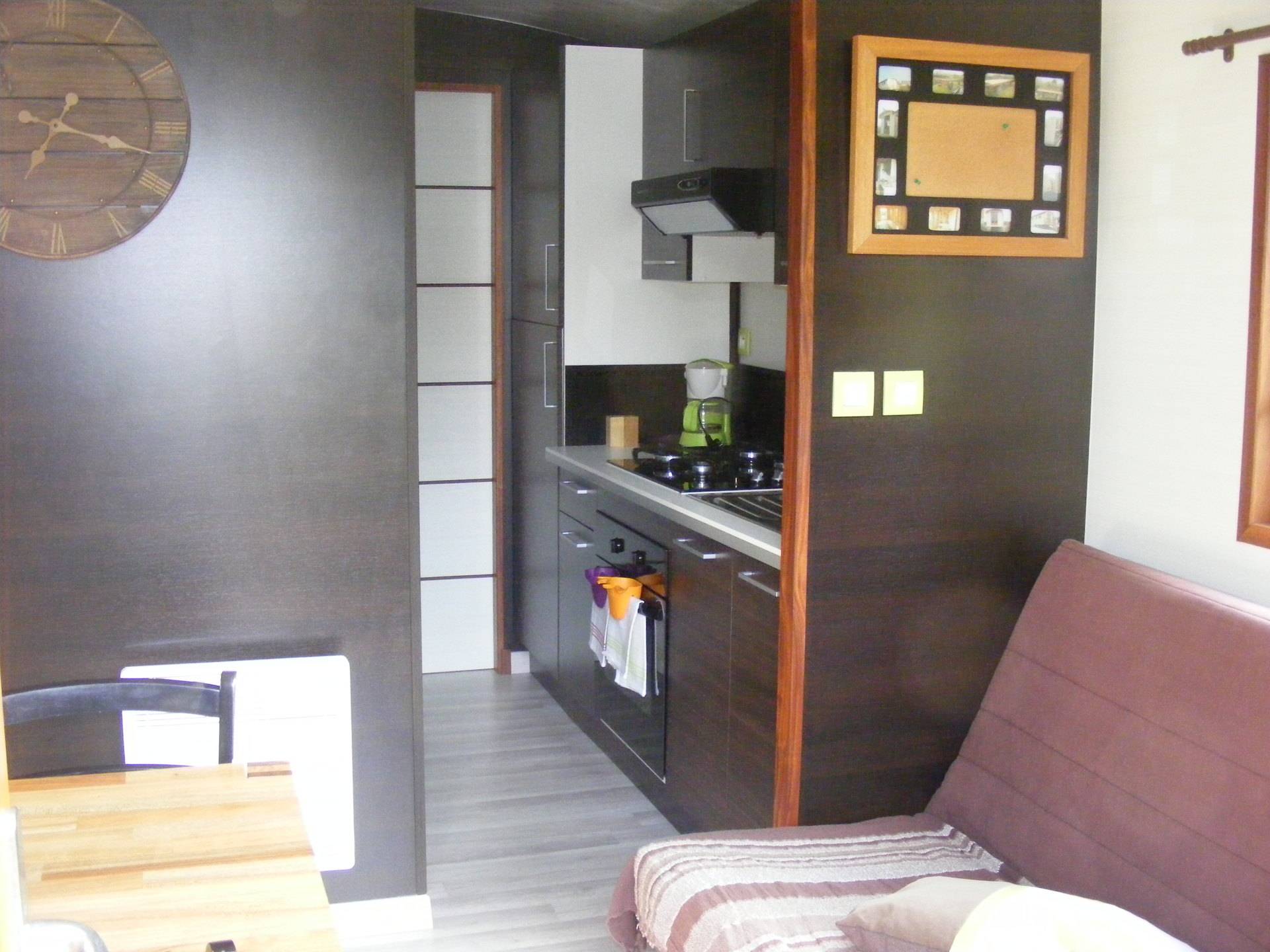 Elle est aménagée d'une chambre avec un lit double, d'une salle d'eau/WC avec baignoire, d'une cuisine équipée (dont réfrigérateur, congélateur, four, plaque de gaz...) et d'un coin séjour avec canapé-lit.