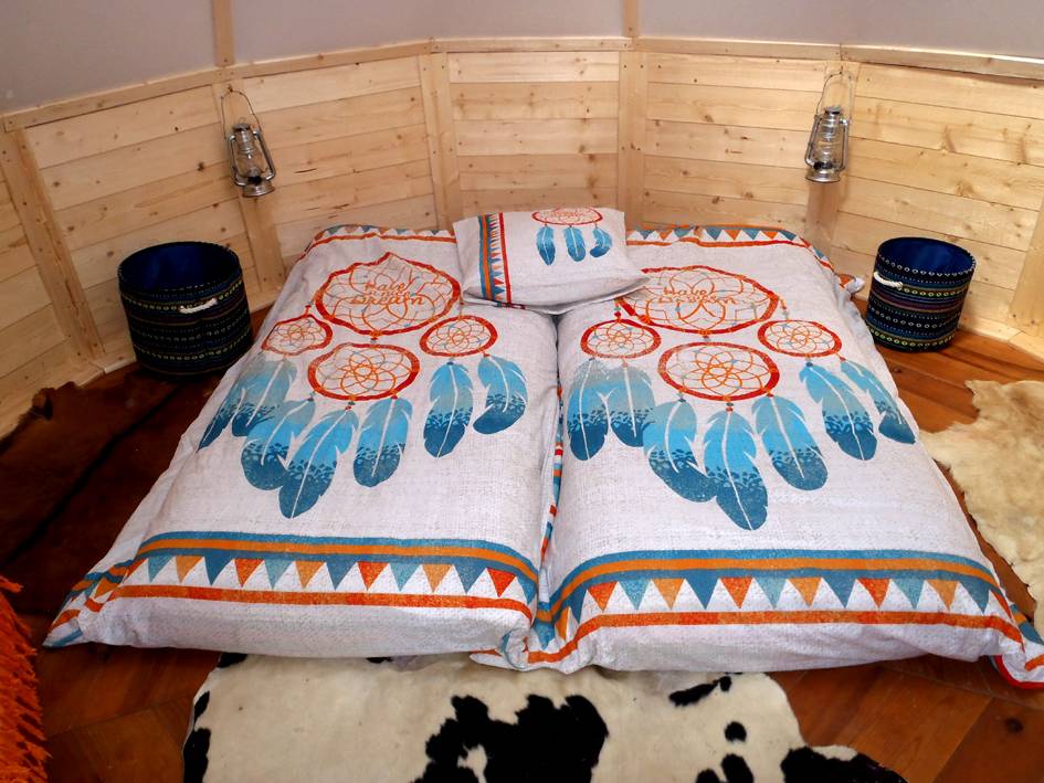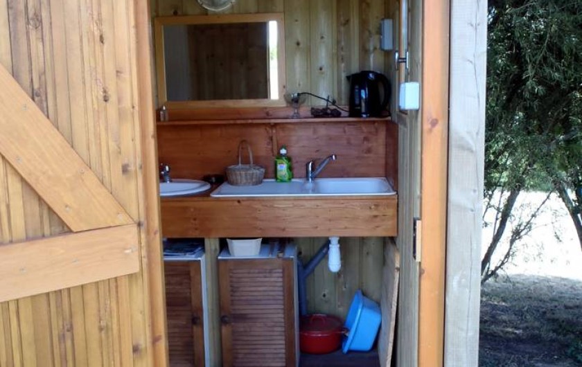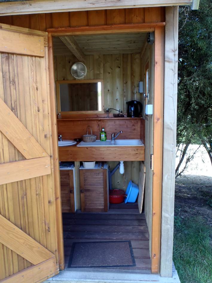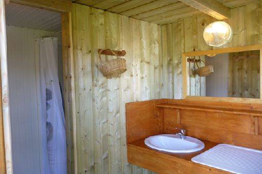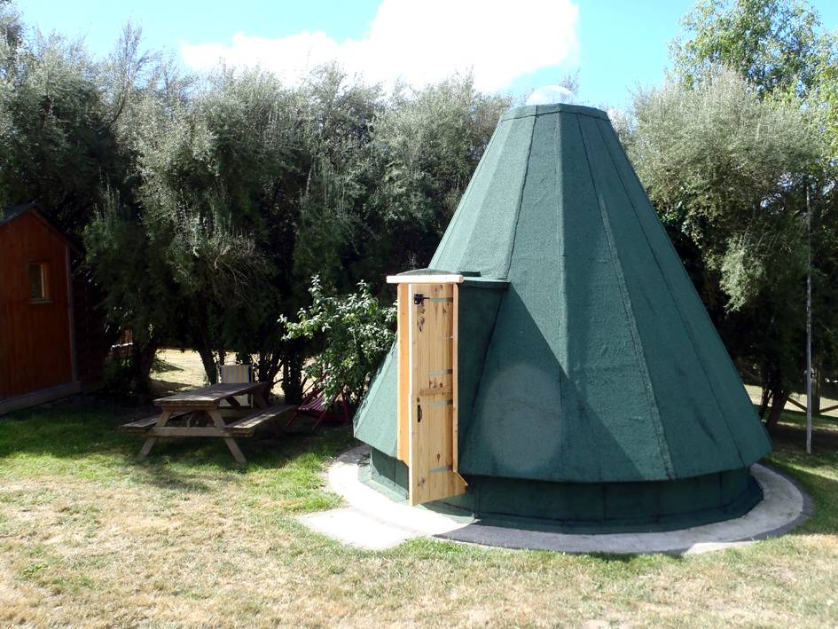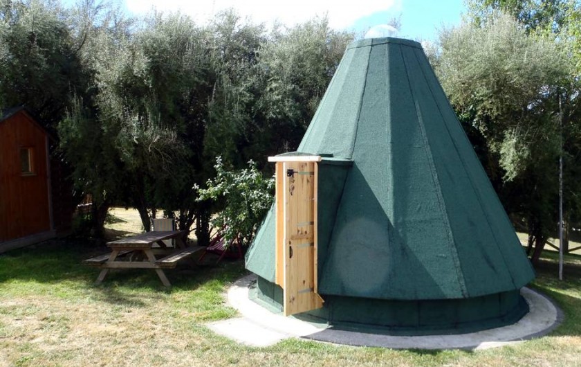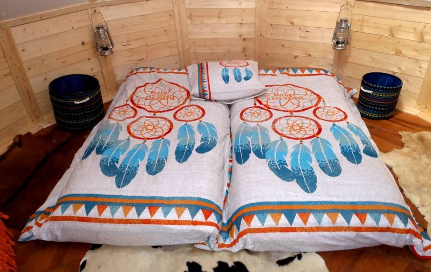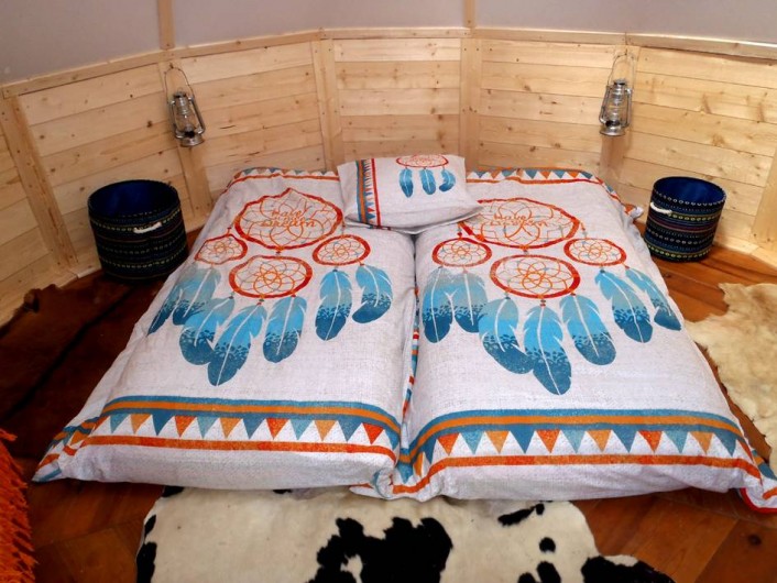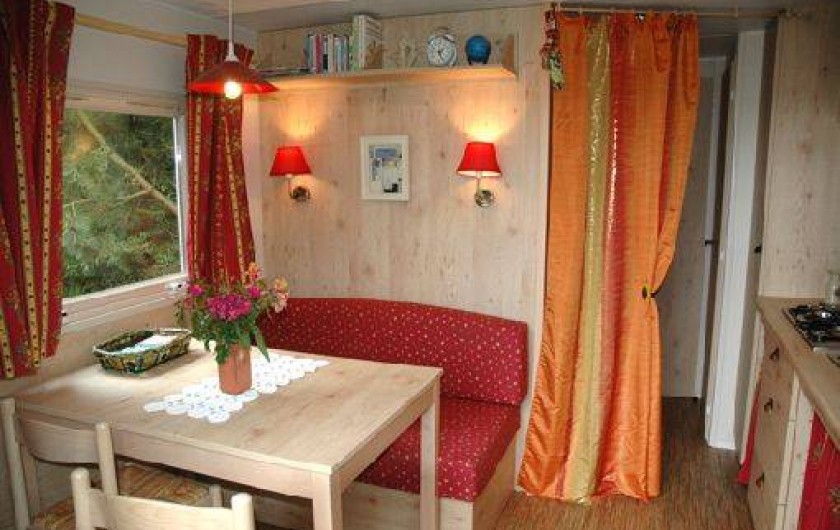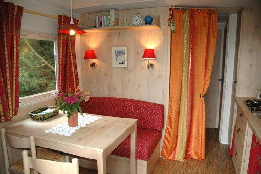 Le mobil-home d'une superficie de 25 m2 est composé de 2 chambres, d'un salon avec con cuisine et d'un cabinet de toilette. Le tipi est équipé de 4 matelas. A proximité : petit bloc sanitaire, cabane de trappeur pour les repas .