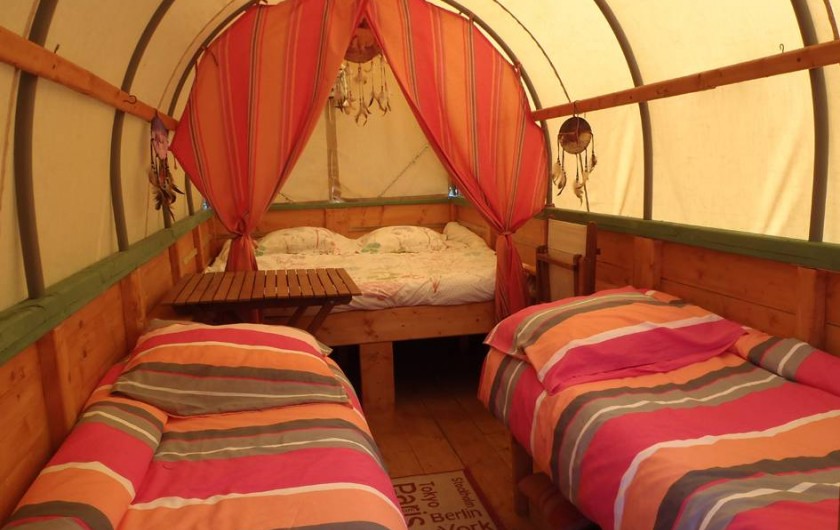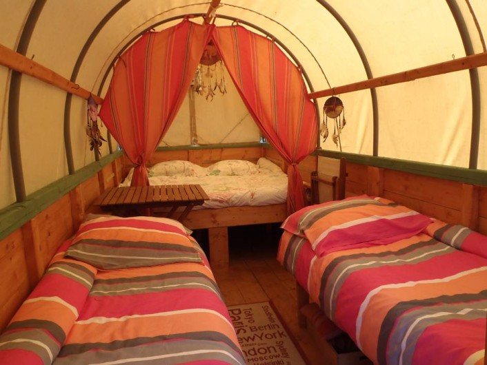 Le chariot est équipé d'un grand lit (2m x 1m80) et de 2 lits banquettes (1m90x 0m60)