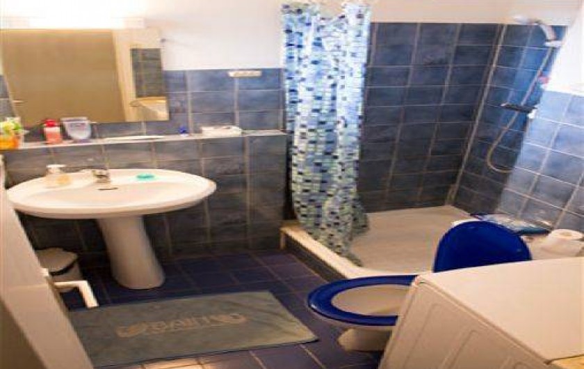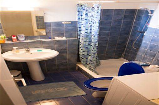 - Salle de bain carrelée avec lave-linge, WC, miroir, douche, ...