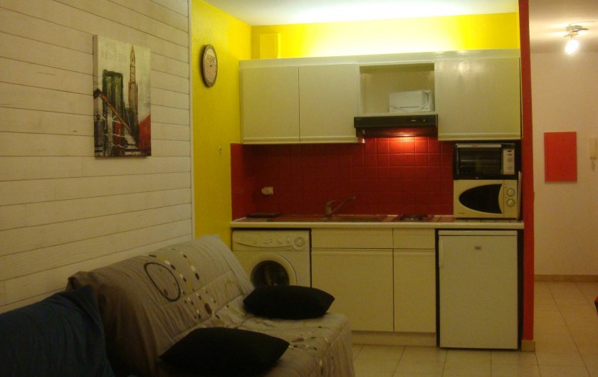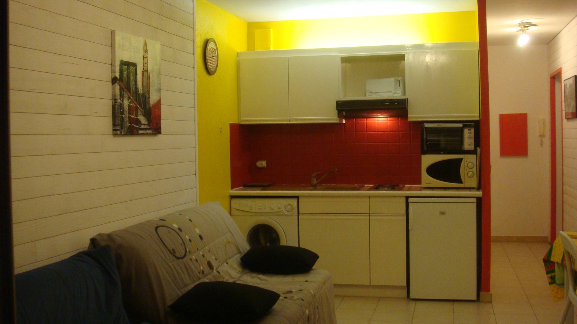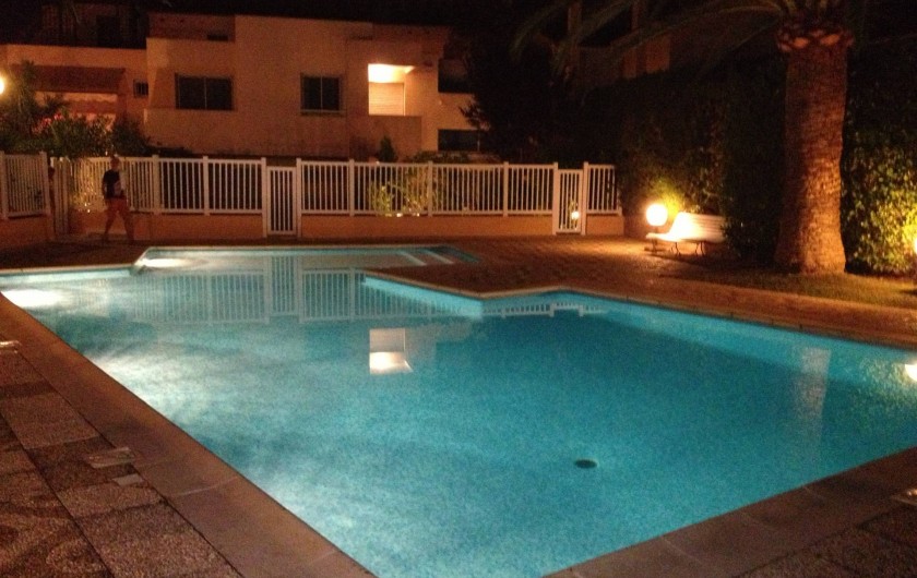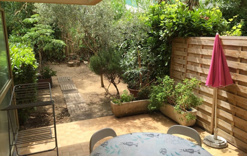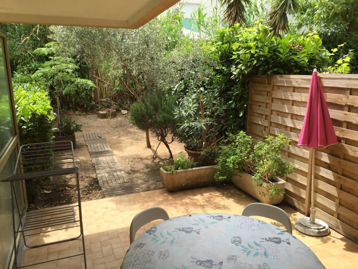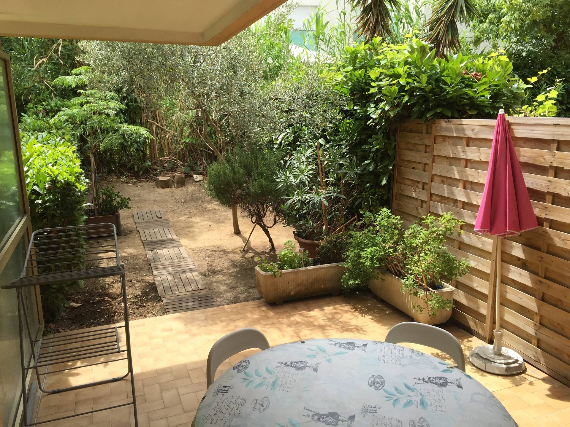 Agréable studio avec déco sympa, très près de la mer, situé dans une résidence fermée avec piscine et garage, dans un quartier calme en rez-de-jardin arboré avec terrasse carrelée et abritée en exposition sud.